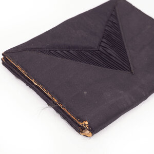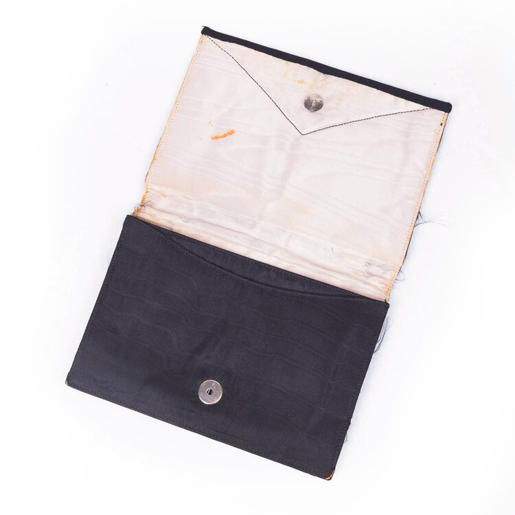 Enveloptas van moire zijde, jaren '20. Zwarte envelop tas van moire zijde, geplisseerde zijde en effen zijde. De tas is gevoerd met champagne kleurige moire zijde, en heeft twee kleine vakjes aan de binnenzijde, en een grote aan de voorzijde. Op de achterkant van de tas bevindt zich een bandje waardoor de tas makkelijk is vast te houden. Conditie: De tas is in redelijke conditie, maar de zwarte zijde is beschadigd op kwetsbare delen zoals de randjes van de tas, ook zijn er vooral op de achterzijden enkele gleeën, waar de ketting of inslag van de stof is verdwenen. Afmetingen: ca. 13 x 18 cm.