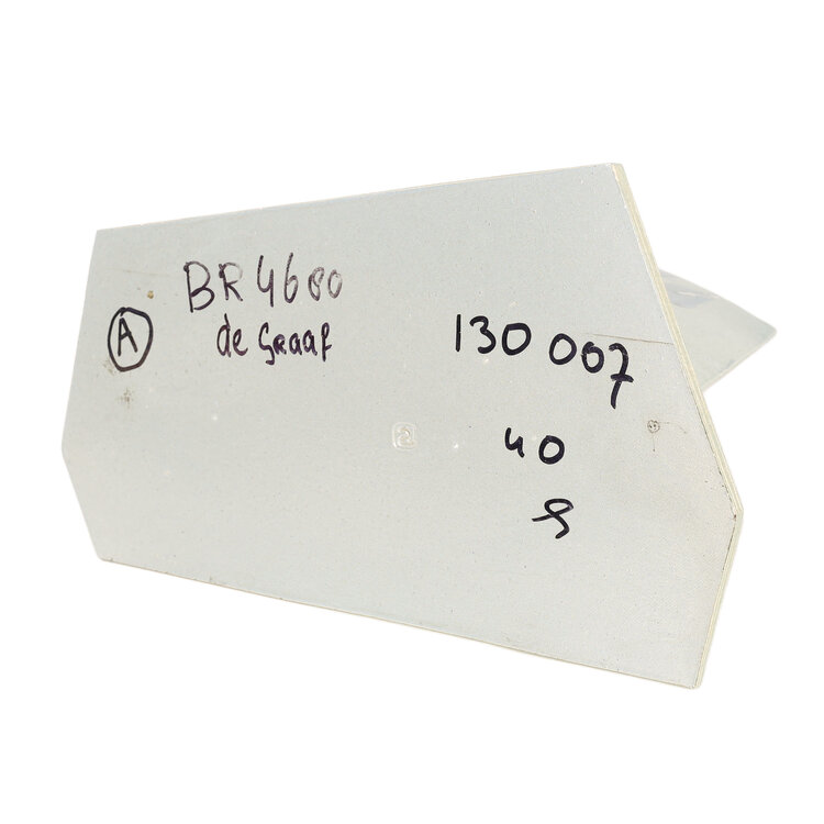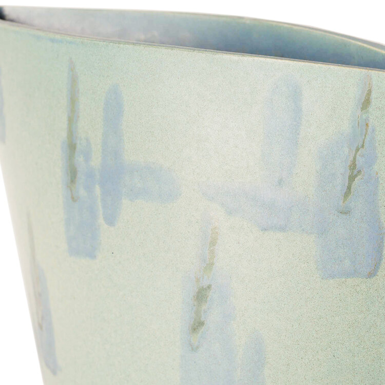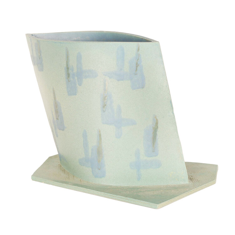 A. de Graaf- v.d. Gaag, Vleugelsculpture turquoise, jaartal onbekend, steenplastiek. Hol turquoise scultpuur met blauwe versieringen. Op de basis zijn in relief geometrische lijnen aangebracht. Conditie: lichte gebruikssporen. Afmeting: H27 x B35 x D21 cm.