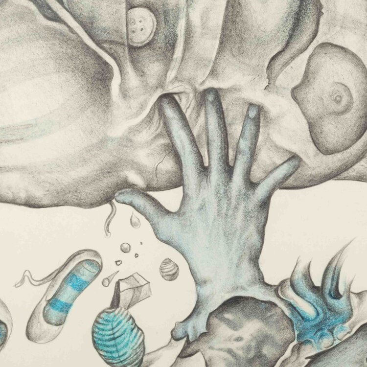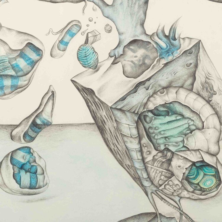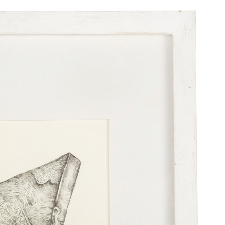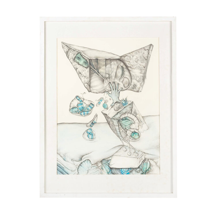 Ab Steenvoorden, Eenzaamheid, 1974. Kleurpotlood op papier reprografie in wit houten lijst. Abstracte illustratie in blauw, groen en grijs. Rechtsonder signatuur. Steenvoorden was een kunstenaar uit Leiden die in verschillende media werkte. Zijn werk is te zien in de openbare ruimte en in de Lakenhal. De etsen van Steenvoorden vertonen allerlei mythisch uitziende figuren, kronkelende vormen en fabelachtige dieren. Conditie: werk goed, lijst matig, verschillende beschadigingen verfverlies, passe partout is linksonder vergeeld. Afmetingen: lijst 75,5 x 57 cm, afbeelding 27,5 x 42,2 cm.