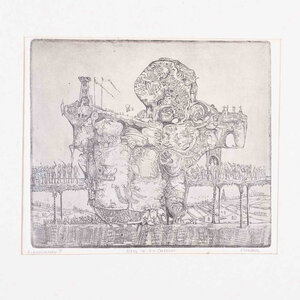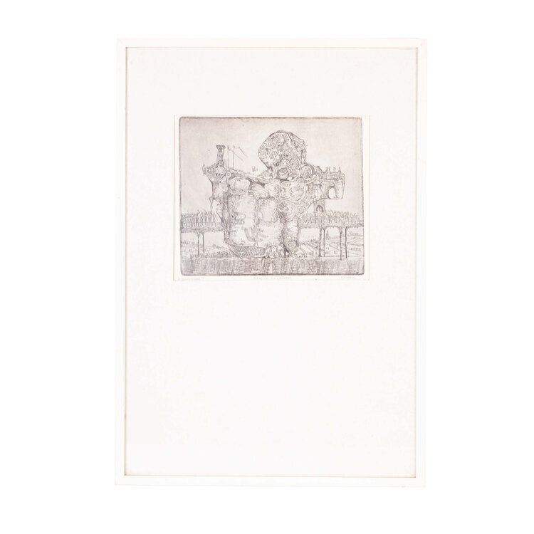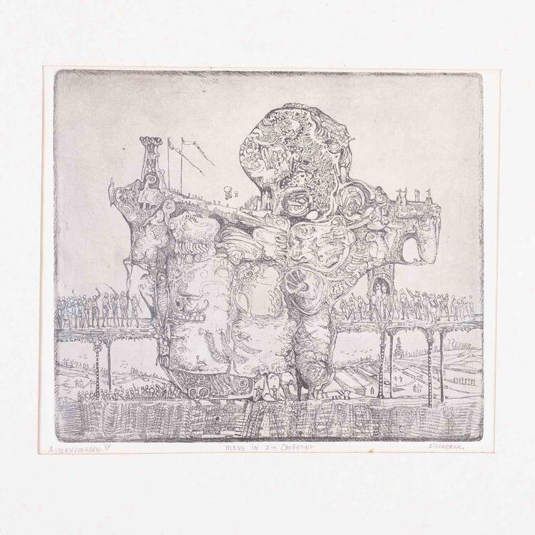 Ab Steenvoorden, Mens in z'n omgeving, 1967. Ets op papier in witte lijst. Fantasierijke abstracte illustratie met groepen mensen en op de achtergrond een zicht op een landschap. Linksonder signatuur en in midden titel; rechts staat geschreven 'Eigendruk.' Steenvoorden was een kunstenaar uit Leiden die in verschillende media werkte. Zijn werk is te zien in de openbare ruimte en in de Lakenhal. De etsen van Steenvoorden vertonen allerlei mythisch uitziende figuren, kronkelende vormen en fabelachtige dieren. Conditie: het werk is in goede conditie, de lijst heeft enkele gebruikssporen en de passe-partout is verkleurd. Afmetingen: lijst ca. 49 x 34 cm, afbeelding ca. 17,5 x 21 cm.