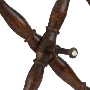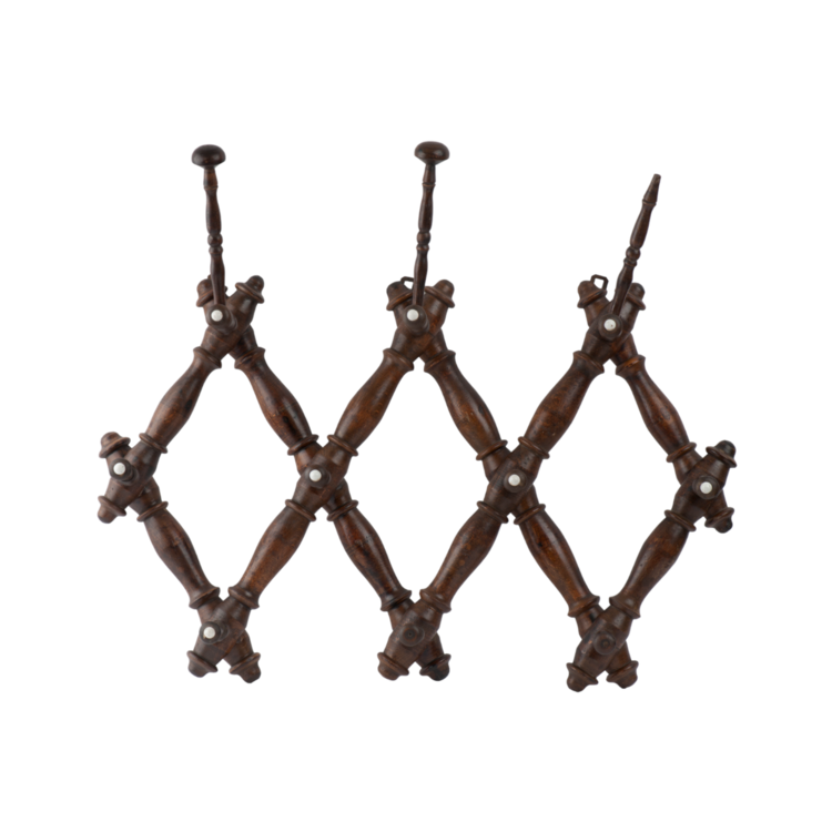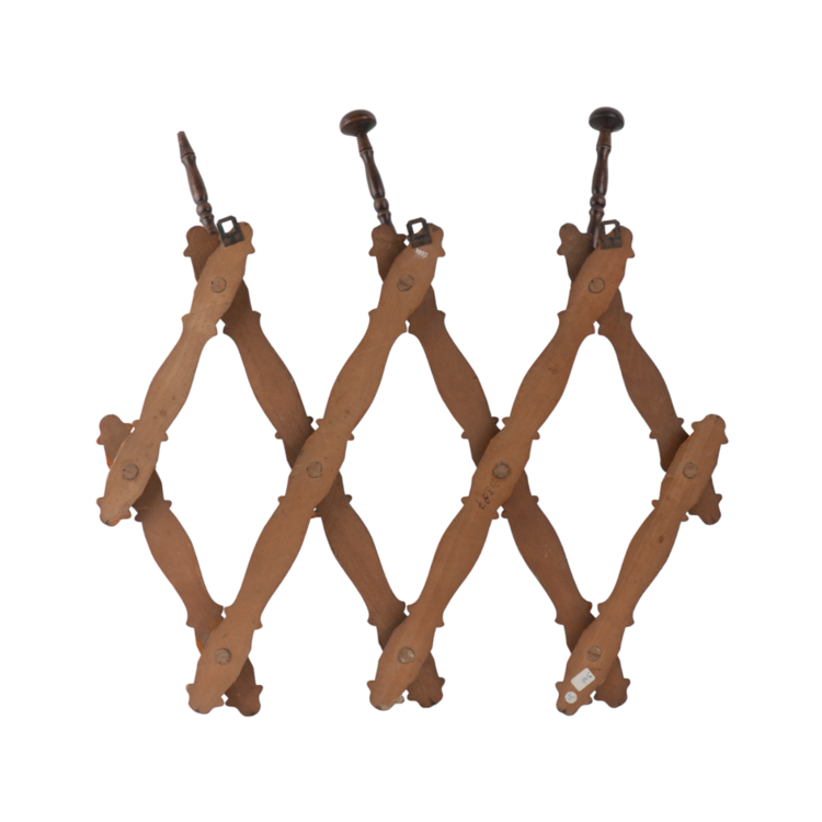 Houten accordeon wandkapstok, donker van kleur. Met dertien haken, waarvan acht met een witte knop. Datering: 19de of 20ste eeuw. Conditie: goed, er mist enkel een houten knop. Afmetingen: ca. hoogte 48 cm, breedte 75 cm, diepte 16 cm.