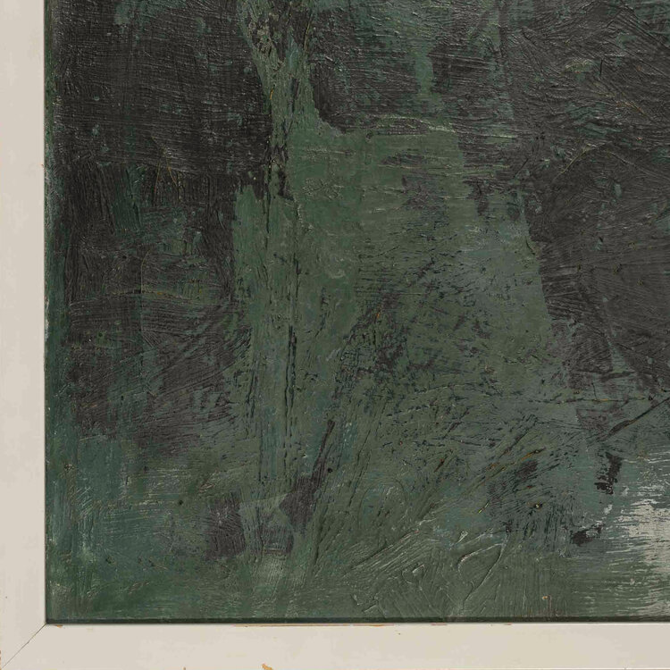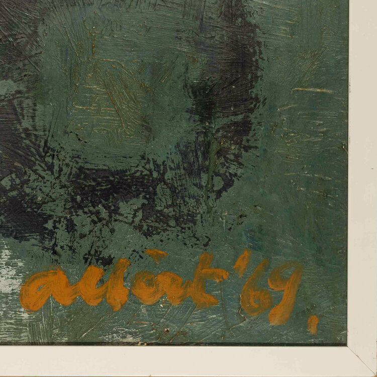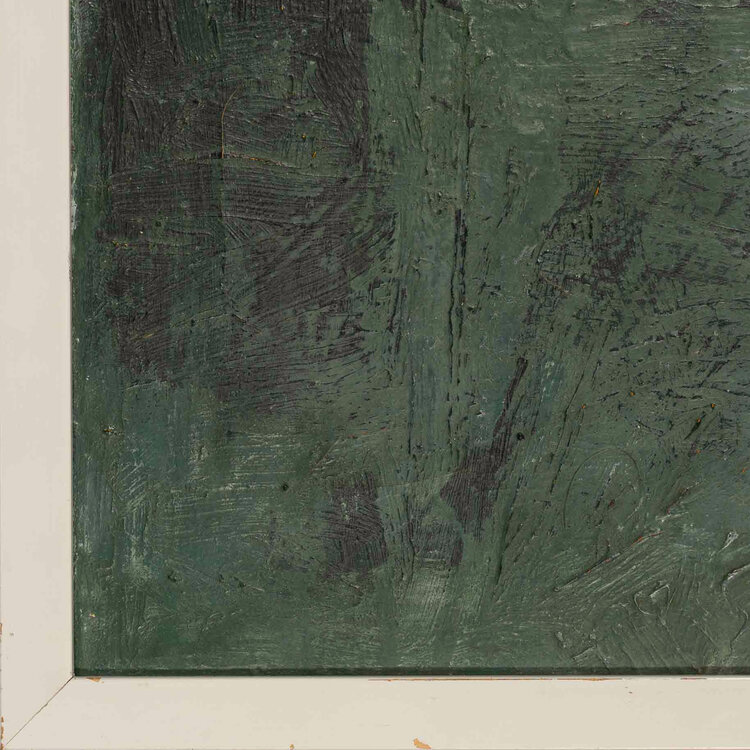 Albert Soons, 'Impulsion', 1969. Olieverf op doek in wit houten lijst. Abstract werk in groentinten waarbij de kwastvegen zichtbaar zijn. Signatuur rechtsonder. Conditie: vertoont gebruikssporen. Afmetingen incl lijst: ca 43 x 54 cm.