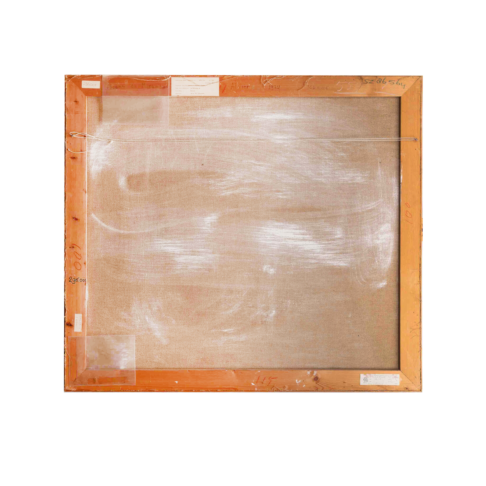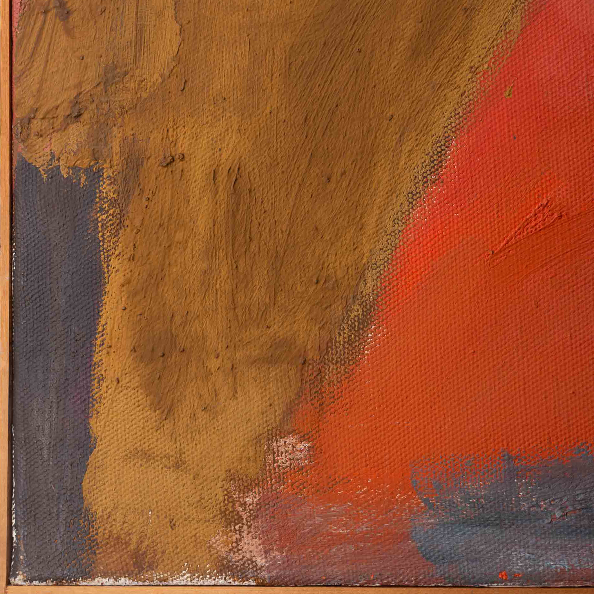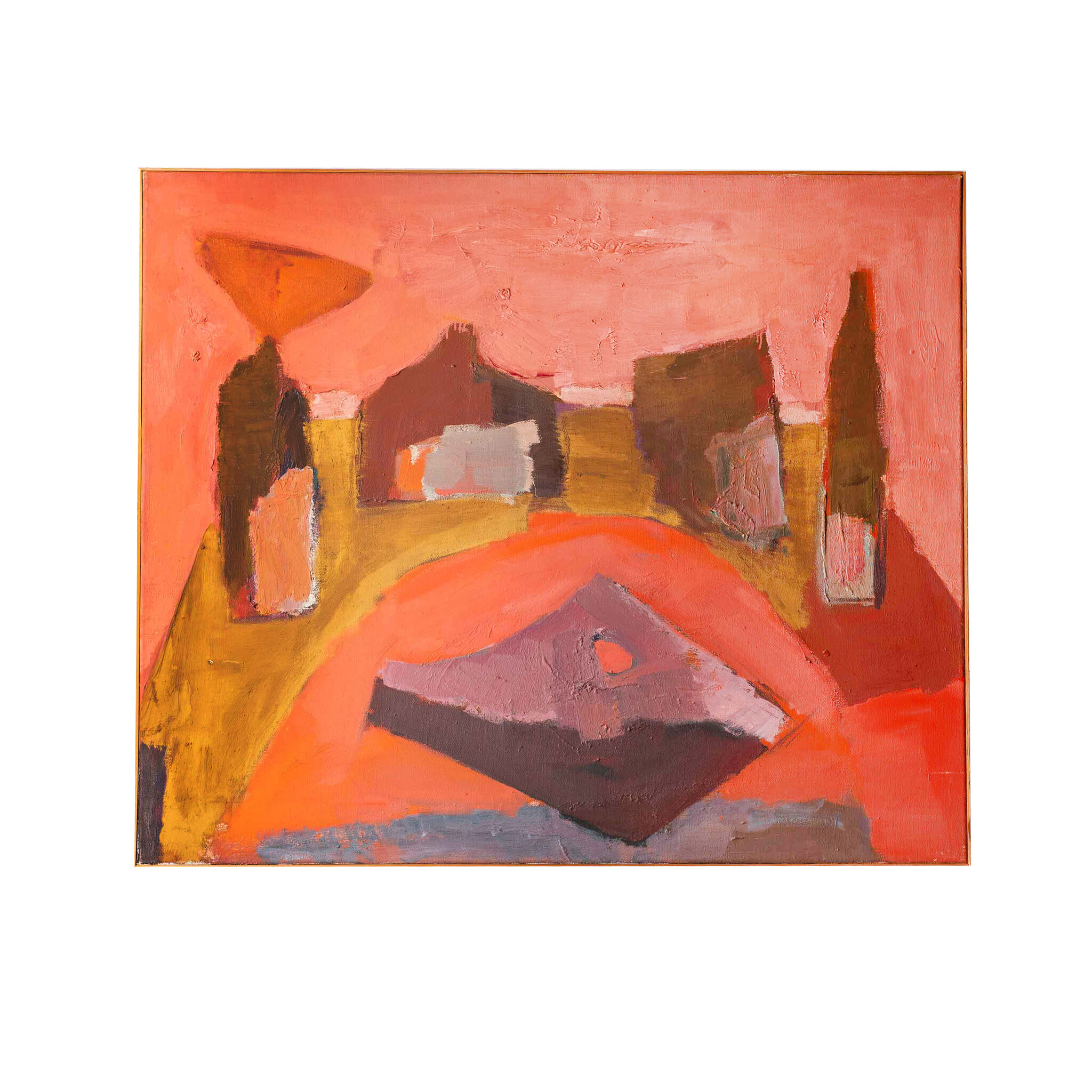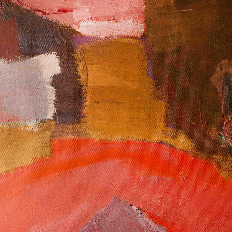 Alfons de Miranda (Hamburg, 1928), 'Atelier', 1997. Olieverf op doek in houten lijst. Abstracte compositie in rood, roze en bruin. Het werk is niet gesigneerd. Conditie: werk is in goede staat, lijst toont wat gebruikssporen. Afmetingen doek: 100 x 115 cm.