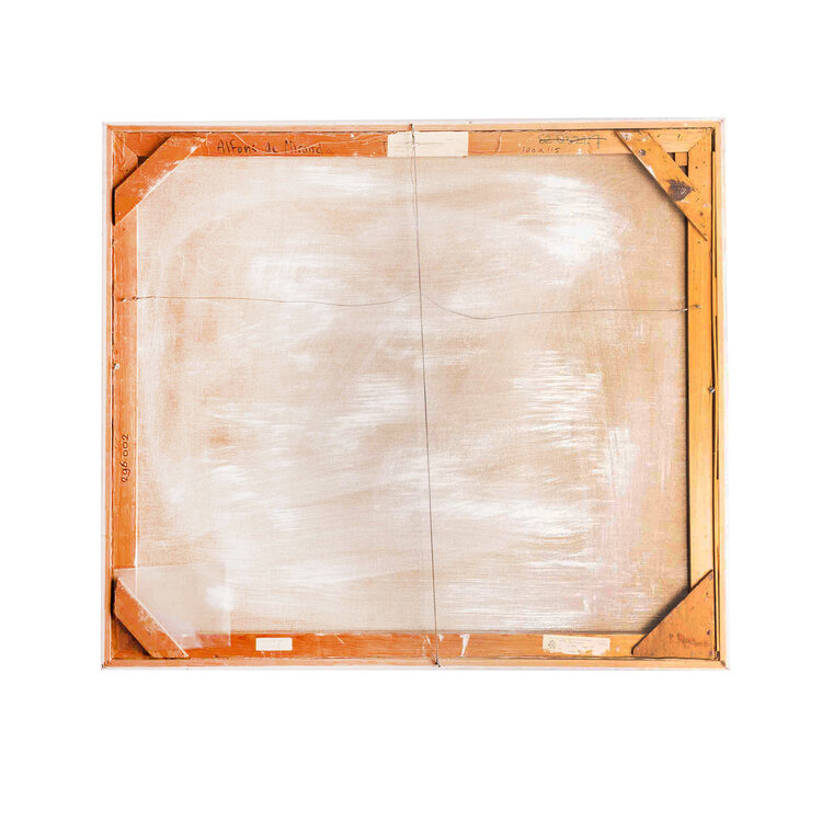 Alfons de Miranda (Hamburg, 1928), 'Twee tafels', datering jaren '70. Olieverf op doek in wit houten lijst. Stilleven met twee tafels, de een met een fruitschaal en de ander met vier flessen. Het werk is niet gesigneerd. Conditie: werk is in goede staat, lijst toont wat gebruikssporen en is wat vuil. Afmetingen lijst: 104 x 120 cm; beeldvlak: 100 × 115 cm