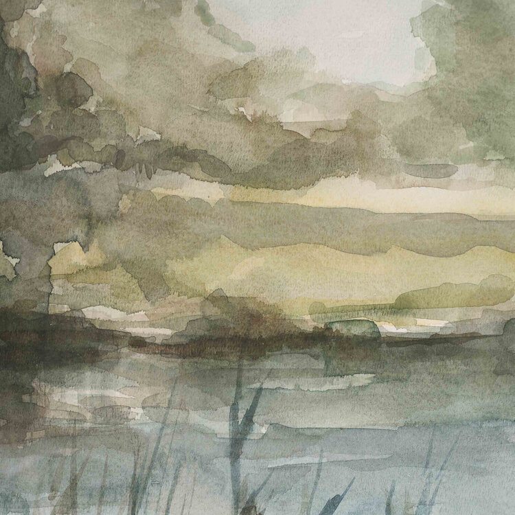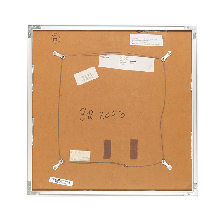 André Tigchelaar, Landschap, jaartal onbekend. Aquarel op papier in metalen lijst. Afbeelding van een water met er omheen riet en bossen. Signatuur linksboven. Conditie: goed, gebruikssporen aan lijst. Afmeting werk zonder lijst: 33 x 32 cm.