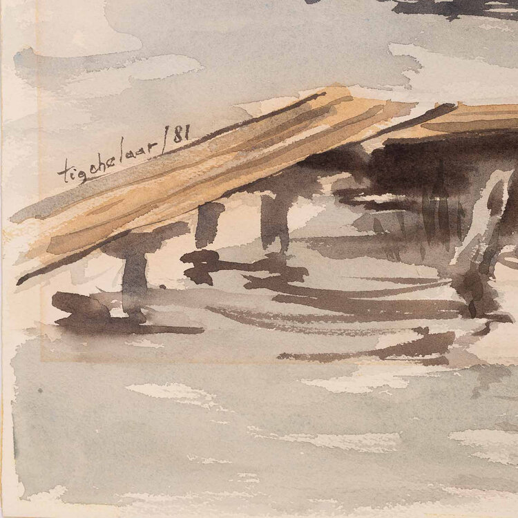 André Tigchelaar, Landschap, 1981. Aquarel op papier van een water met vlonders en rechtsonder riet. Signatuur en jaar linksonder. Het werk is niet ingelijst. Conditie: prima, maar rondom verkleuring waar de passepartout heeft gezeten en aan de achterzijde blauwe krijt en rondom tape aan de randen. Afmeting: 53 x 38 cm.