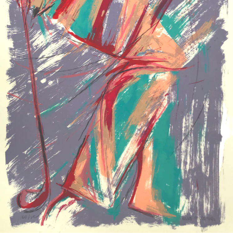 Anke Peddemors, 'Golfer', datering: onbekend. Zeefdruk, 76 x 56 cm, voormalige bedrijfscollectie. Zeefdruk met een golfer in een expressionistische stijl, oplage 69/75. Signatuur Anke Peddemors, rechtsonder. Anke Peddemors (1947) genoot haar opleiding aan Academie de Schans. Peddemors is vanaf 1975 professioneel kunstenaar. Ze maakt figuratief werk in een breed scala aan onderwerpen zoals sportende figuren, musici, geisha's, landschappen en bloemen. Conditie: goed. Het werk is niet ingelijst.