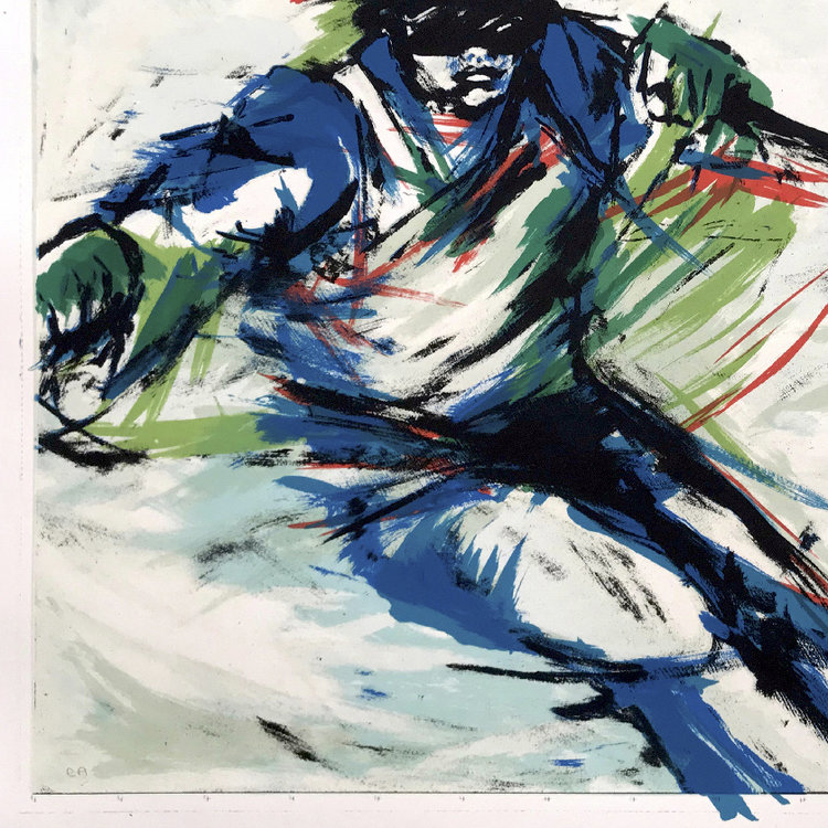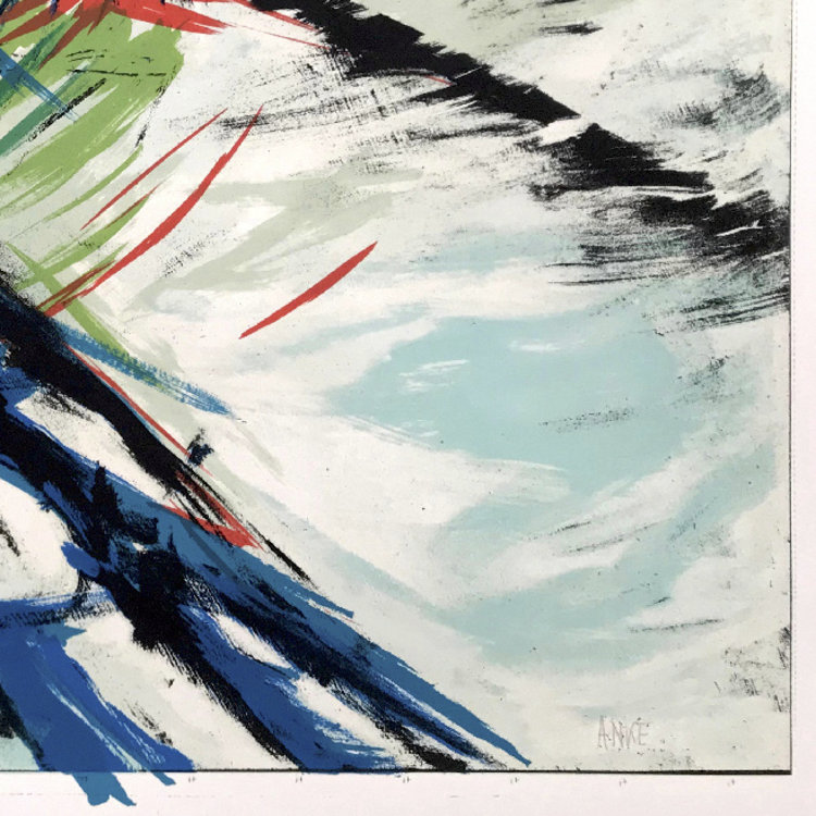 Anke Peddemors, 'Skiër', datering: onbekend. Zeefdruk, épreuve d’artiste, 76 x 56 cm. Zeefdruk met een skiër in een expressionistische stijl. Signatuur Anke, rechtsonder, E.A. linksonder. Anke Peddemors (1947) genoot haar opleiding aan Academie de Schans. Peddemors is vanaf 1975 professioneel kunstenaar. Ze maakt figuratief werk in een breed scala aan onderwerpen zoals sportende figuren, musici, geisha's, landschappen en bloemen. Conditie: goed.