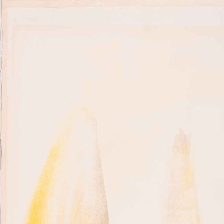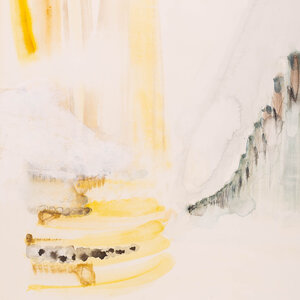 Annemarie Spijkerman, zonder titel II, 1986. Aquarel op papier zonder lijst. Abstracte voorstelling in geel, blauw, grijs en groen met zwarte details. Conditie: Het werk is in goede conditie, wel heeft het enkele taperesten van toen het was ingelijst. Afmetingen: 70 x 50 cm.