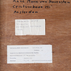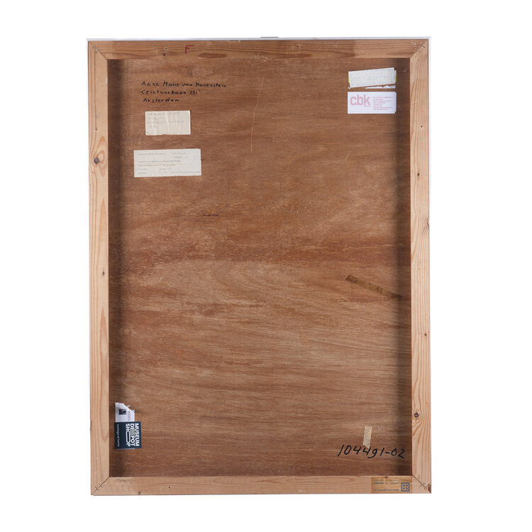 Abstract werk met donkere kleuren door Annemarie Ravenstein. Gemengde techniek op papier. Gedateerd en gesigneerd. Datering: 1984. Conditie: het werk is in goede staat de plastic omlijsting is lichtbeschadigd. Afmetingen: 100 x 75 cm.