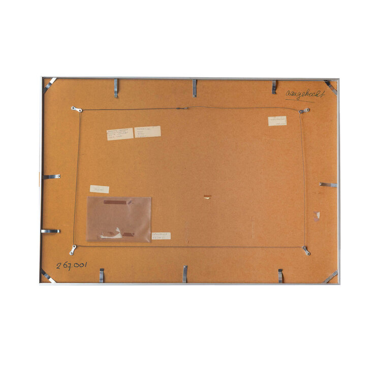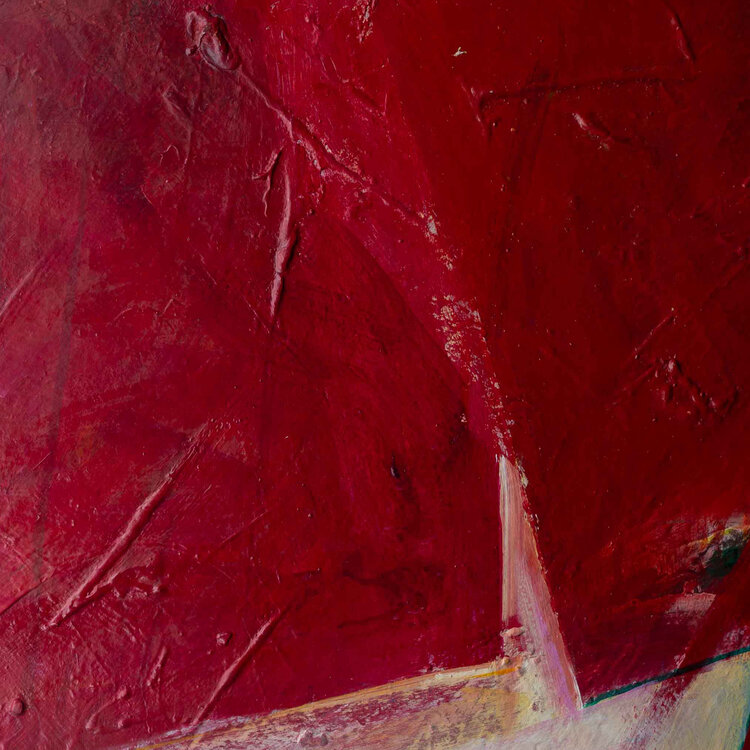 Annette van Wijck (1945), Zonder titel, 1988. Acrylverf op karton in metalen lijst zonder glas. Abstracte compositie van drie rode blokken voor een roze achtergrond. Signatuur rechtsonder. Conditie: hier en daar wat kleine schade plekjes in de verf. Afmetingen: 70 x 100 cm.