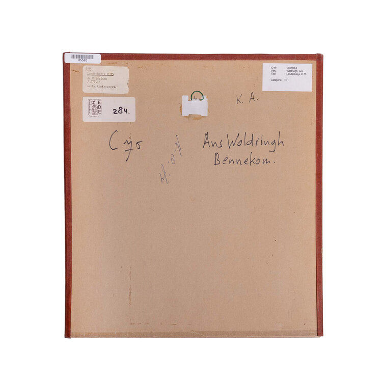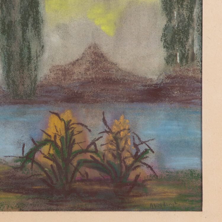 Ans Woldringh, Landschapje C 75, 1974. Pastelkrijt op papier in passe-partout. Illustratie van een heuvellandschap met water. Signatuur rechtsonder. Conditie: werk is in goede conditie, passe-partout is verkleurd. Afmeting 37 x 38,5 cm.