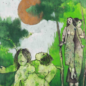 Ans Wortel, 'Wij in 't struikgewas onder de zon', jaartal onbekend. Gouache op papier in zilverkleurige lijst. Voorstelling van een groep naakte mensen tussen de bomen, linksboven een gouden zon. Linksonder gesigneerd met 'a wortel.' Onderaan de teskt: "Wij in 't struikgewas onder de zon.." Een boek over het werk van de kunstenaar wordt meegeleverd. Conditie: goed, met lichte gebruikssporen. Afmetingen incl lijst ca.: 50,5 x 40,5 cm.