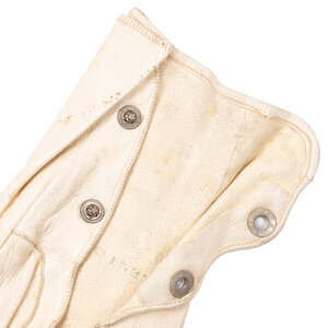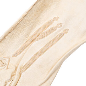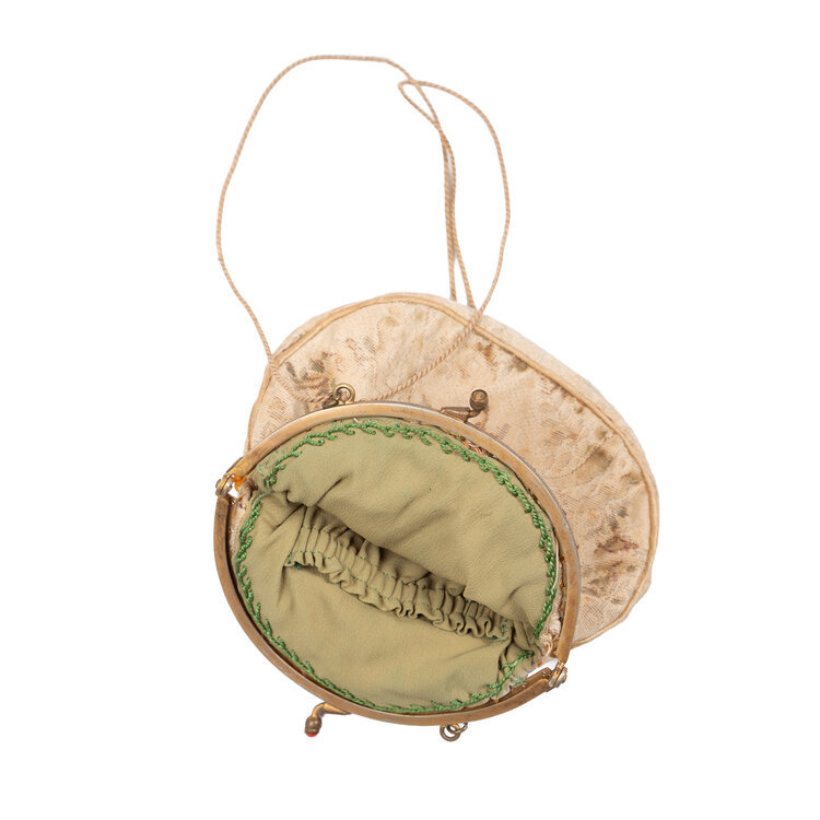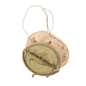 Antiek tasje met handschoentjes en waaierset, eind 19e/begin 20ste eeuw. Het kleine crèmekleurige tasje met bloempatroon heeft een metalen beugel. Deze is aan de voorzijde versierd met gekleurde steentjes en aan de beugel zit een koordje. De binnenzijde heeft een groene voering met opbergzakje; Een paar crèmekleurige leren handschoentjes met drukknopjes (maat 7); De waaierset bestaat uit meerder bladen die zijn versierd met gestanste patronen. De bladen kunnen aan elkaar geregen worden met een lint. Conditie: vertonen sporen van gebruik en ouderdom, zoals slijtageplekken. Bovenop de sluiting ontbreekt een rood steentje. Afmetingen tasje: 13 x 12 x 1 cm; hoogte met hengsel 32 cm. Afmetingen handschoenen: ca. 23 x 7 cm. Afmetingen waaierbladen: ca. 17 x 0,5 / 1,5 cm.