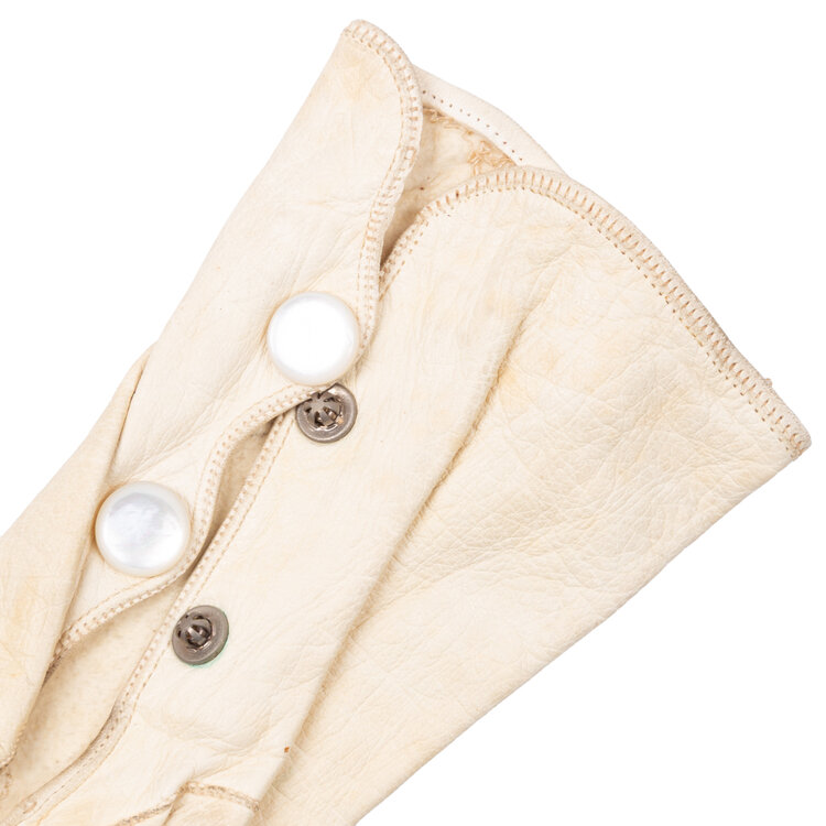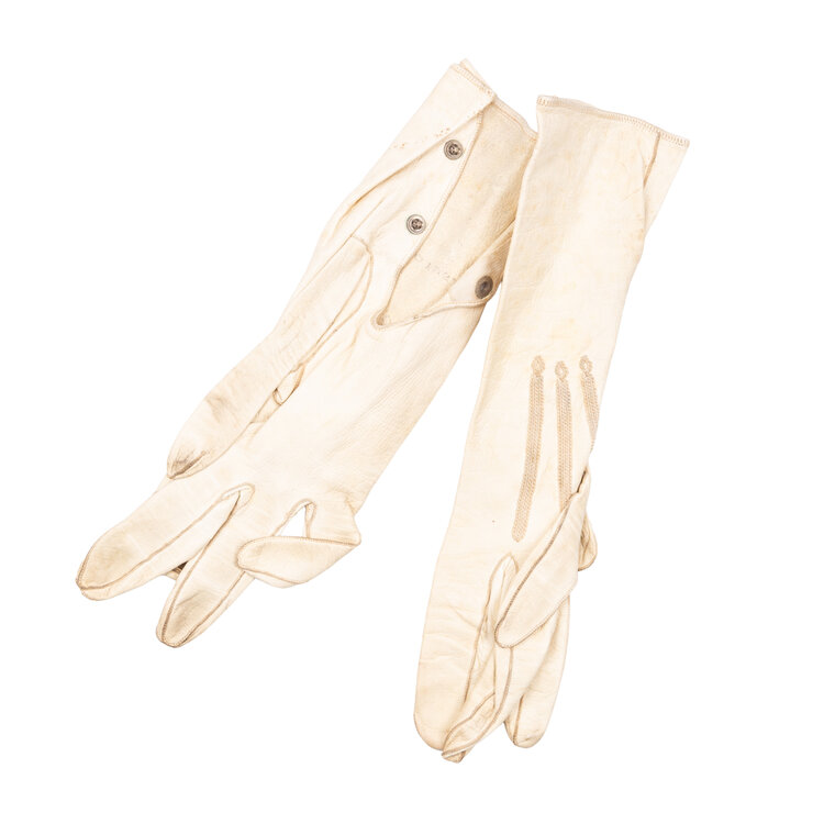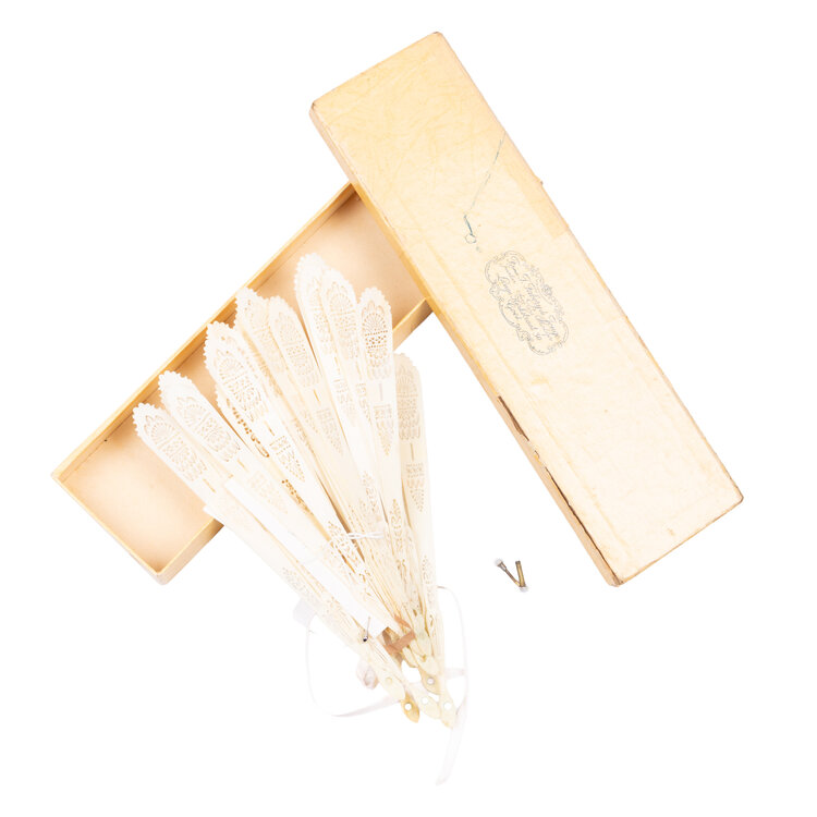 Antiek tasje met handschoentjes en waaierset, eind 19e/begin 20ste eeuw. Het crèmekleurige tasje met bloempatroon heeft een metalen beugel; Een paar crèmekleurige leren handschoentjes met drukknopjes (maat 7); De waaierset bestaat uit meerder bladen die z