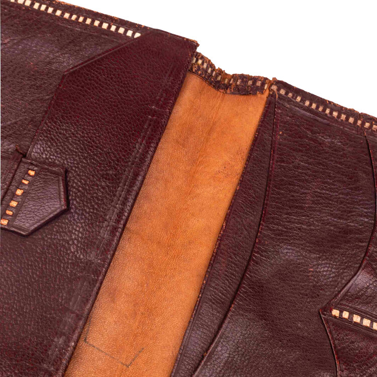 Bordeaux rode portemonnee met gouden opdruk, vermoedelijk eerste helft 20ste eeuw. Het patroon doet denken aan de boeken uit de 16e en 17e eeuw. In de portemonnee bevinden zich 6 vakjes. Conditie: De portemonnee is in gebruikte conditie, en op kwetsbare delen zoals de randen van de portemonnee is de bovenste laag van het leer afgesleten. Afmetingen: Portemonnee gesloten 14,5 x 10 cm. Open 14,5 x 20 cm