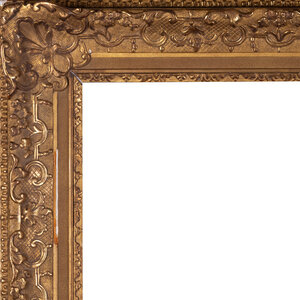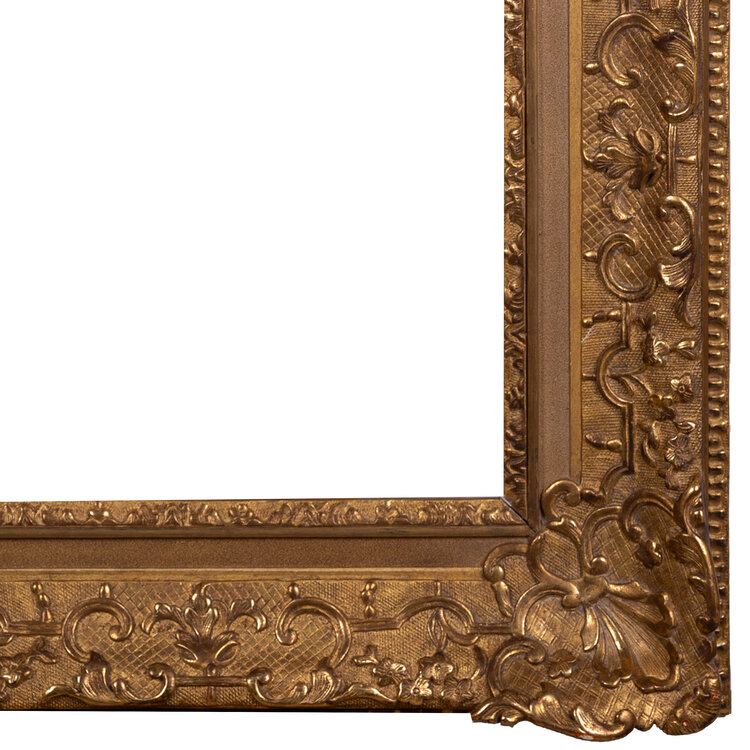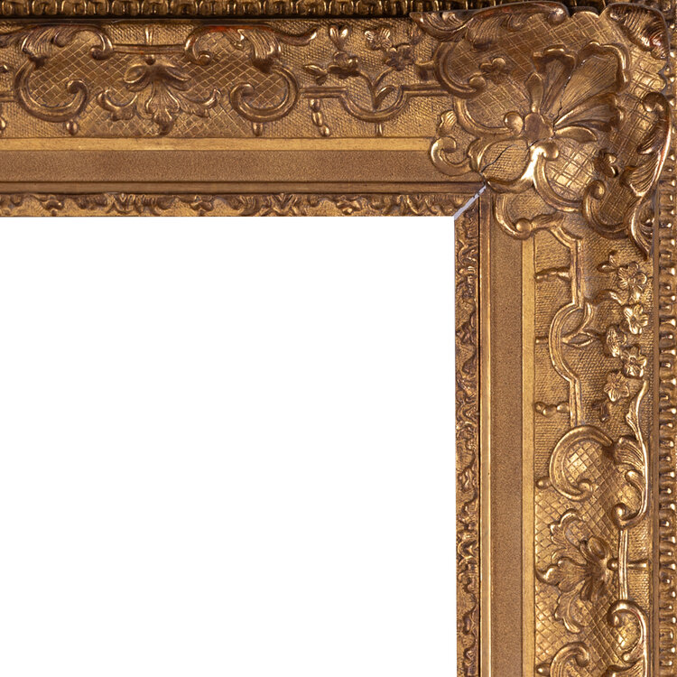 Antieke houten lijst; ca. 89 x 126 x 10 cm. Antieke goudkleurige houten lijst, rijk versierd in barokke stijl. De lijst heeft gehangen in Het Scheepvaartmuseum in Amsterdam. Datering: eind 19e / begin 20ste eeuw. Conditie: vertoont sporen van gebruik en ouderdom, zoals verlies van/barsten in het profiel, slijtage aan de verf. Afmetingen: Buitenmaat ca. 89 x 126 x 10 cm; Binnenmaat ca. 65 x 102,5 cm.