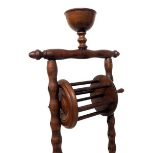Antieke donkerbruine houten wolwinder of wolhouder. Deze werd gebruikt om wol of garen van een streng tot een bol te winden. Datering ca. 1900. Conditie: in goede staat. Afmetingen: H. 115 cm, Br. 27 cm, D. 22 cm.