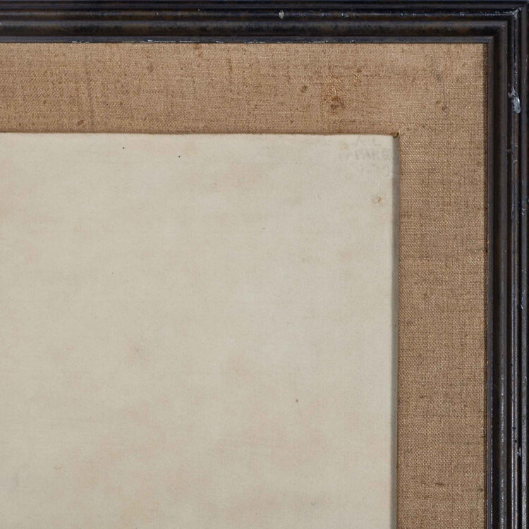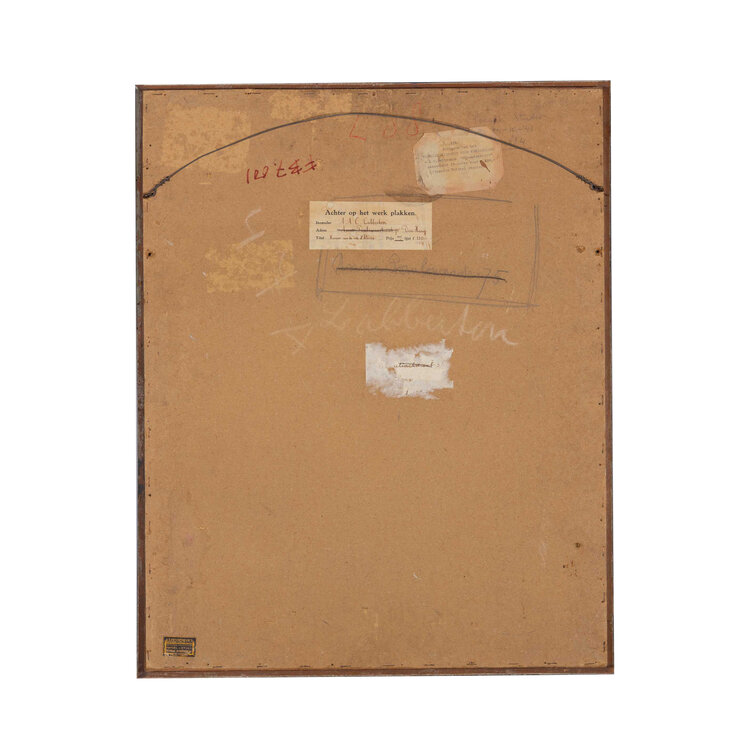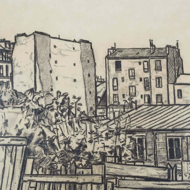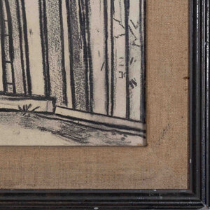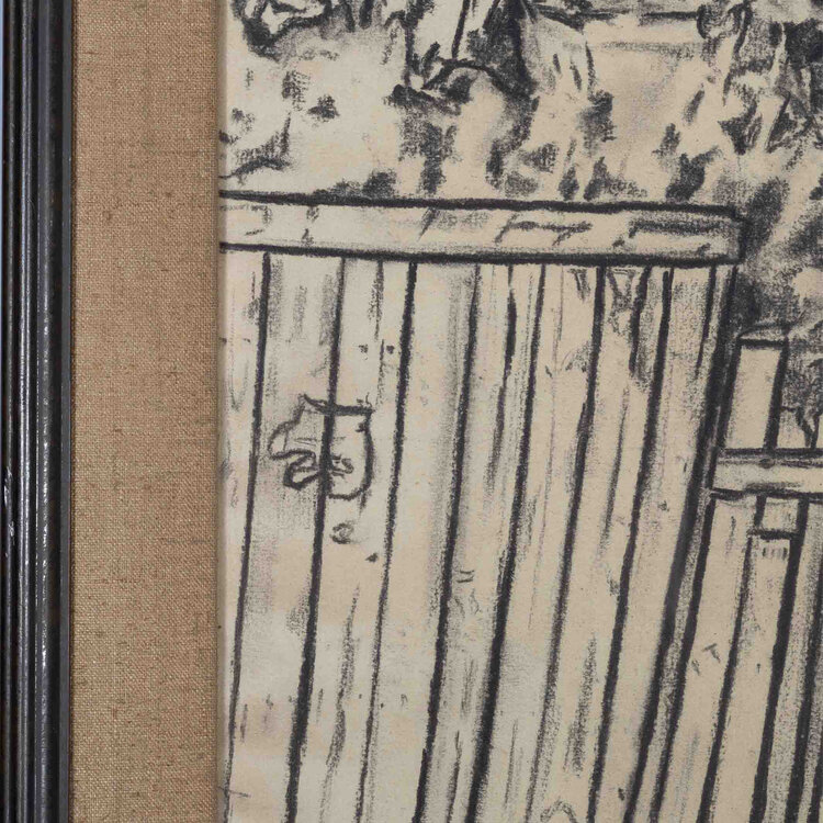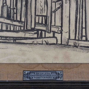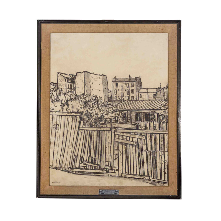 Anton Labberton (1904-1987), 'Straatgezicht' / 'Huizen van de rue d'Alésia', 1944. Houtskooltekening in houten lijst met afbeelding van een straatbeeld met schutting, bosjes en huizen. Het Kröller-Müller Museum heeft ook een werk van deze kunstenaar in de collectie. Signatuur linksonder. Conditie: papier is verkleurd, lijst is beschadigd. Afmetingen incl lijst: ca 72 x 57 cm.