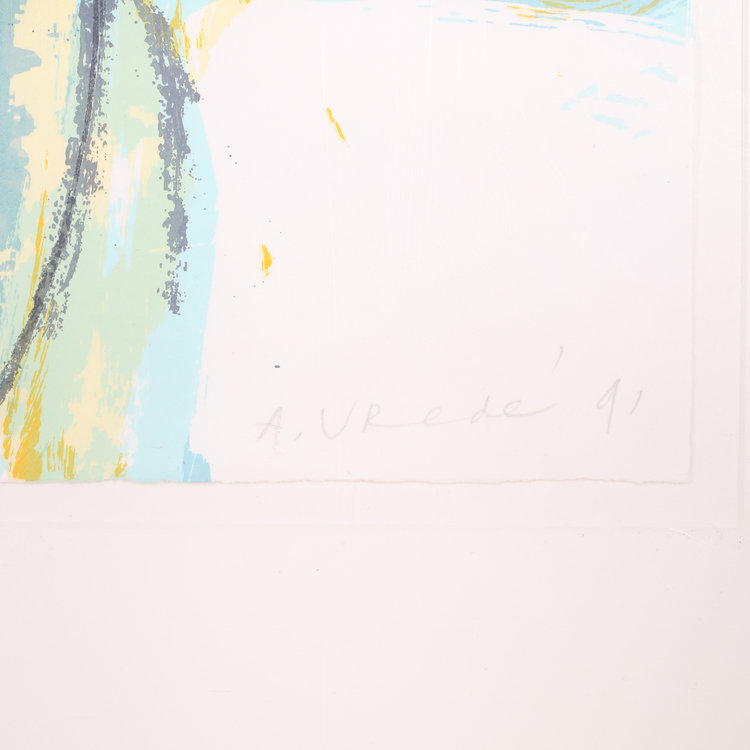 Anton Vrede, Teddy bear-birds, 1991. Zeefdruk, oplage 12/15. Kleurrijke voorstelling van knuffeldieren. Conditie: goed, gebruikssporen op lijst en plastic. Afmetingen: 56 x 75 cm.