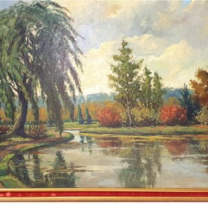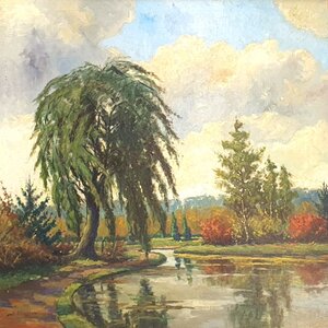 An(toon) Jacobus Hovens, 'Vijverlandschap', ca 1940-1950. Olieverf op doek. Afgebeeld is een vijverlandschap in impressionistische stijl, linksonder gesigneerd. Antoon verhuisde vanuit Venlo met zijn ouders richting Sint Oedenrode omstreeks 1920. Hij werkte hier zoals zijn vader (tevens genaamd Antoon), in de beeldenfabriek 'Sint Oda' in Sint Oedenrode. Hij polychromeerde religieuze beelden. Daarnaast was hij kunstschilder, hij schilderde veelal het Brabantse landschap en interieurs. Conditie: Het schilderij is in goede conditie. Afmetingen: 113,5 cm x 104 cm incl. lijst, 95 cm x 85 cm excl. lijst.