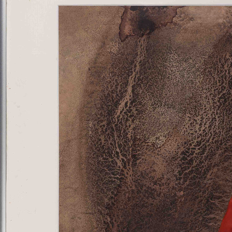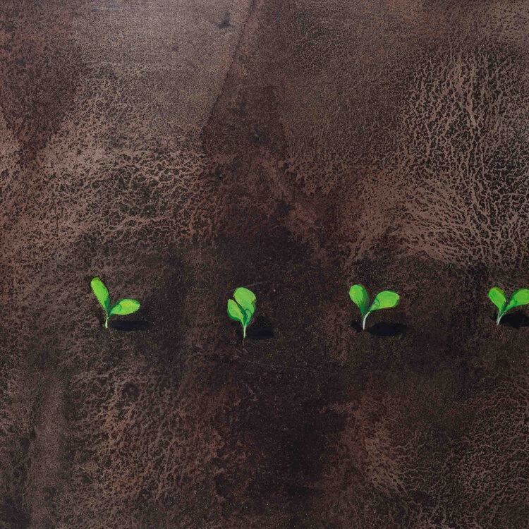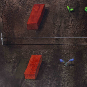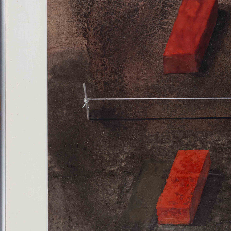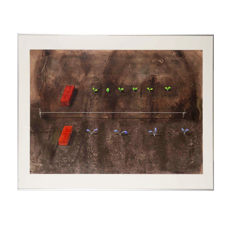 Arthur Stam, 'Tuin', datering onbekend. Gouache op papier met passe-partout in metalen lijst met kunststof plaat. Afbeelding van een moestuin met twee rijen jonge plantjes in de zwarte aarde, ertussen een touwtje met rode bakstenen. Signatuur ontbreekt. Conditie: scheur in passe-partout, gebruikssporen. Afmetingen incl lijst: ca 80 x 100 cm.
