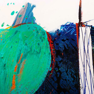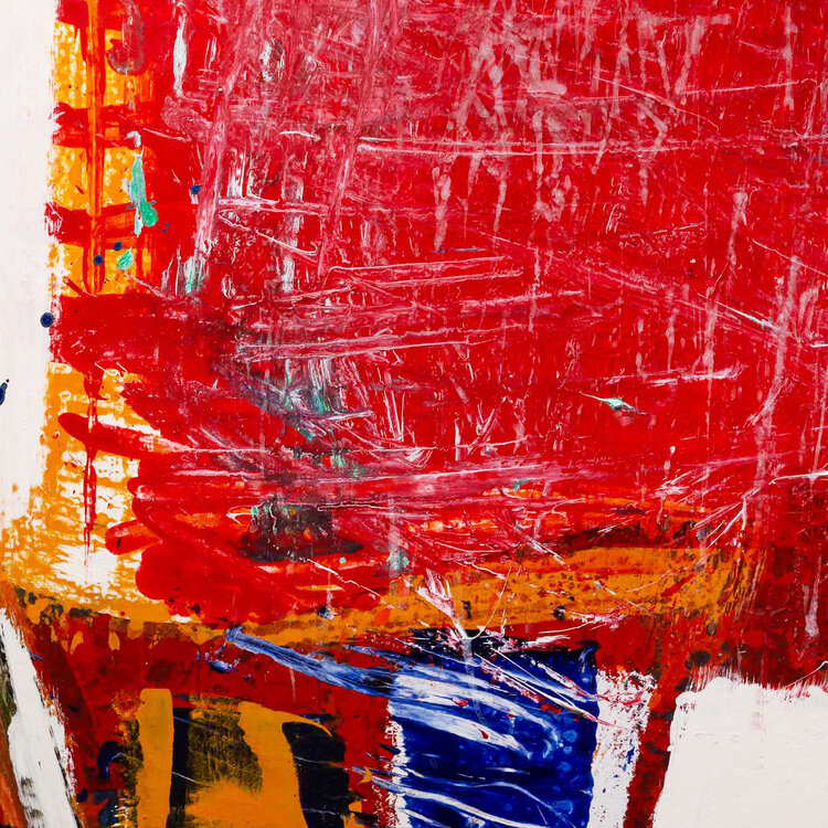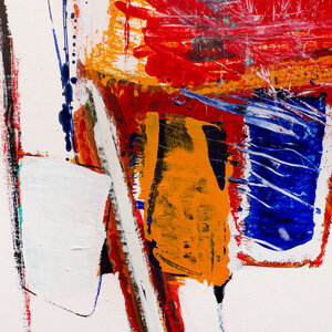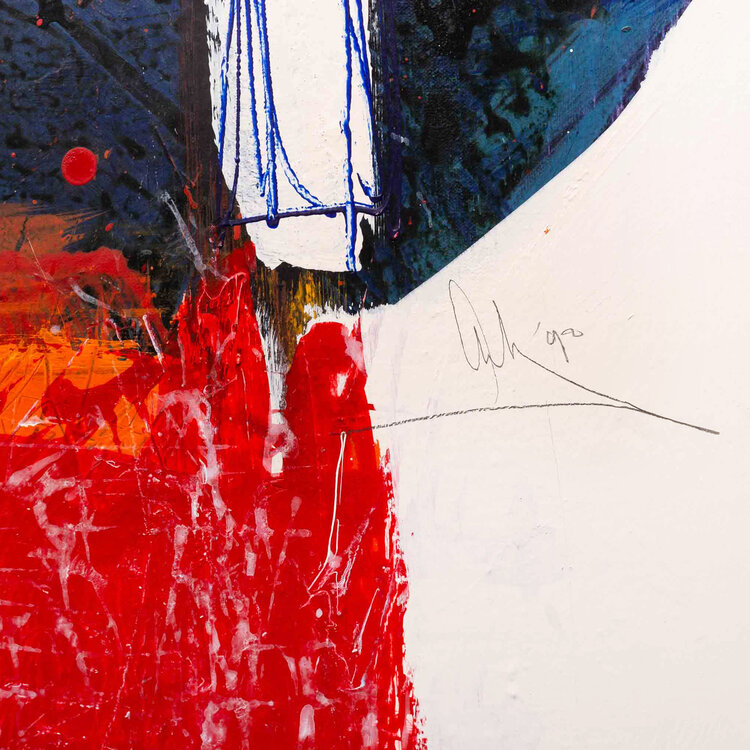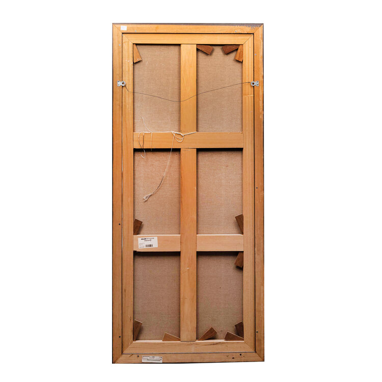Arty Grimm, Compositie, 1998. Acryl op doek in zilverkleurige lijst. Abstracte compositie van vormen in blauw, groen, rood en geel voor een witte achtergrond. Signatuur in midden rechts. Een boek over de kunstenaar en met een afbeelding van dit werk erin wordt meegeleverd. Conditie: lichte gebruikssporen aan de lijst, maar het werk is in goede conditie. Afmetingen lijs: 183 x 92 cm.