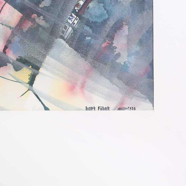 Bart Filet, Vogelvlucht, 1991. Aquarel in metalen lijst. Abstracte voorstelling in donkere kleuren met gele, rode en blauwe accenten. Rechtsonder signatuur en jaar. Conditie: goed, gebruikssporen aan lijst. Afmetingen lijst: 62 x 52 cm.