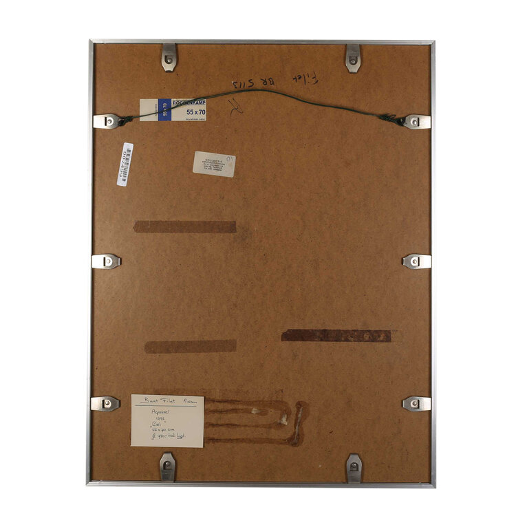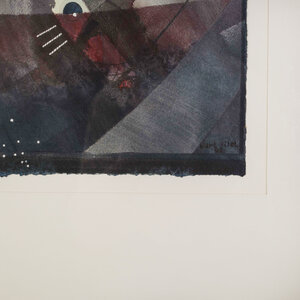 Bart Filet, Cel, 1992. Aquarel in metalen lijst. Abstracte voorstelling van donkere kleuren met lichte accenten en linksboven een huis, brug en twee bomen. Rechtsonder en jaar signatuur. Conditie: goed, gebruikssporen aan lijst. Afmetingen lijst: 70 x 55 cm.