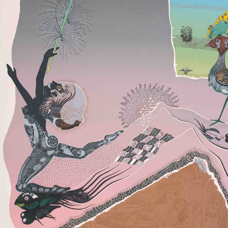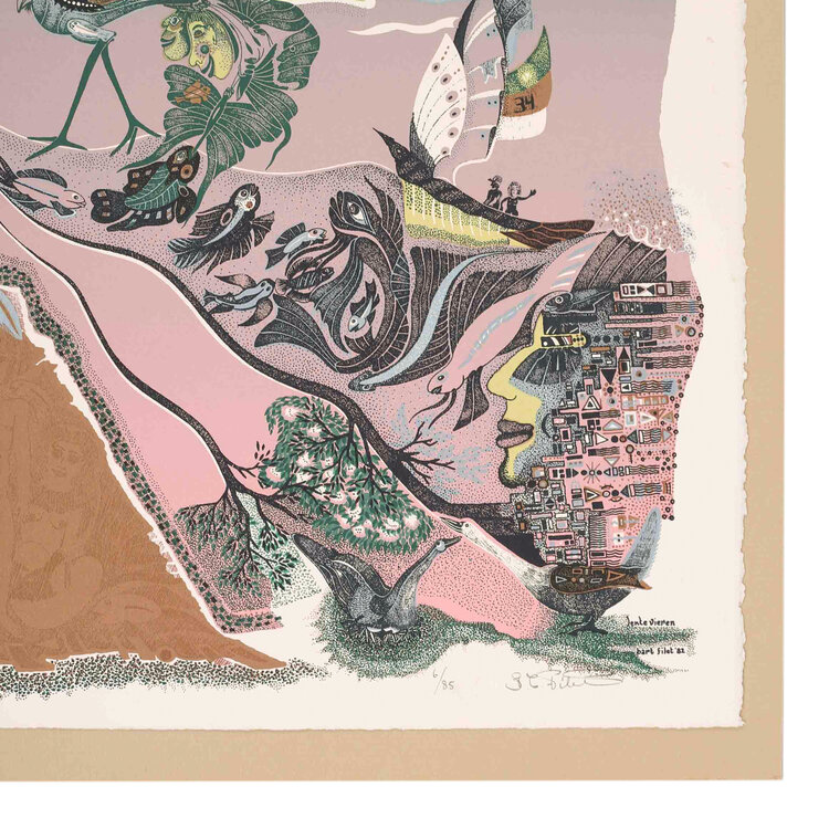 Bart Filet, Lente vieren, 1982. Litho op papier op grijs karton, oplage 6/85. Abstracte voorstelling van figuren en dieren met kleurrijke accenten. Rechtsonder oplagenummer, signatuur en jaar. Conditie: goed. Afmetingen werk: 76 x 57 cm.