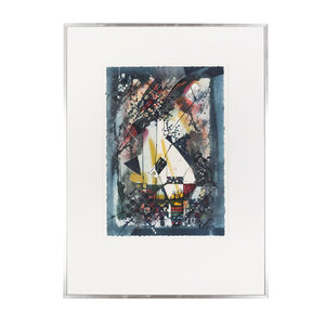 Bart Filet, Chip, 1984. Aquarel in metalen lijst. Abstracte voorstelling van donkere kleuren met accenten in rood en geel. Rechtsonder signatuur en jaar. Conditie: goed, gebruikssporen aan lijst. Afmetingen: 80 x 60 cm.