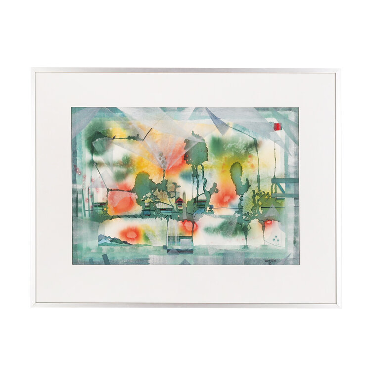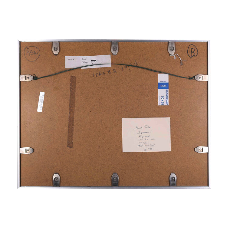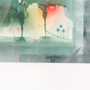 Bart Filet, Sporen, 1992. Aquarel in metalen lijst. Abstracte voorstelling in groen, rood en geel. Rechtsonder signatuur en jaar. Conditie: goed, gebruikssporen aan lijst. Afmetingen werk: 34 x 49 cm en lijst 50 x 65 cm.