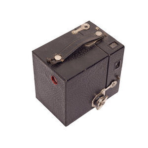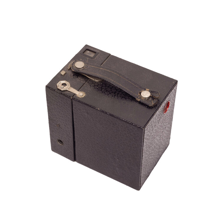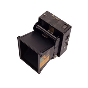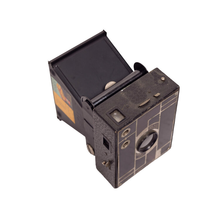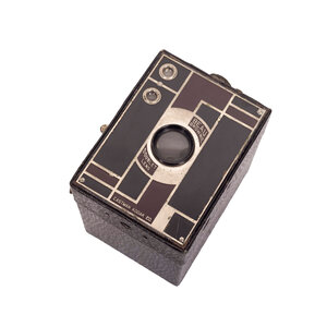 Beau Brownie Kodak camera, Eastman Kodak Co. Deze camera is ontworpen door Walter Dorwin Teague en heeft een tweekleurig geëmailleerd geometrisch Art Deco design voorpaneel. De Beau Brownies werden gelanceerd in 1930 in 5 kleuren: zwart, blauw, groen, roze en bruin. In 1933 is Kodak gestopt met de productie van deze camera's. Conditie: hier en daar gebruikssporen, het gat van het handvat is aan een zijde doorgescheurd. Datering: 1930-1933. Afmetingen: ca. 10 x 7,5 x 11 cm.