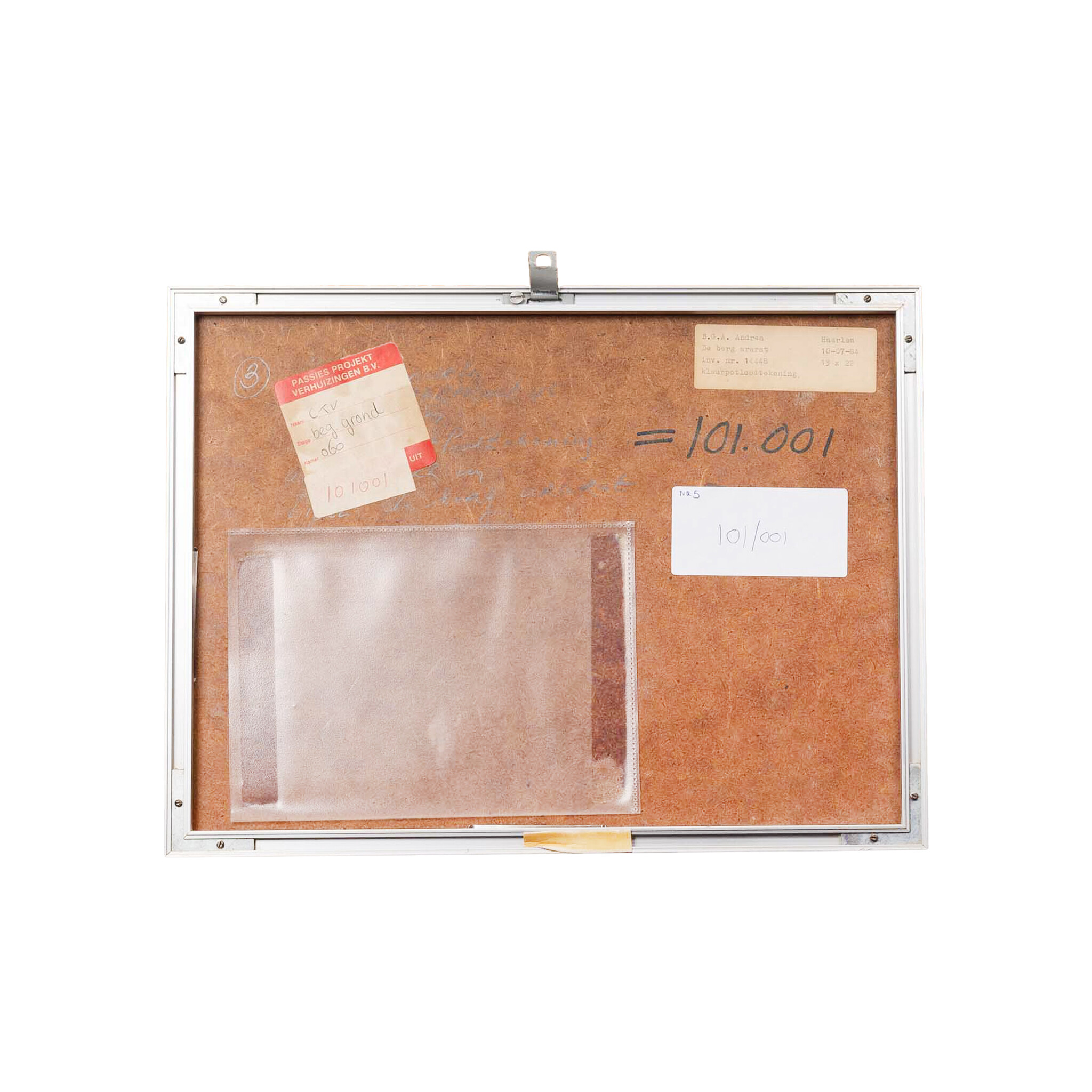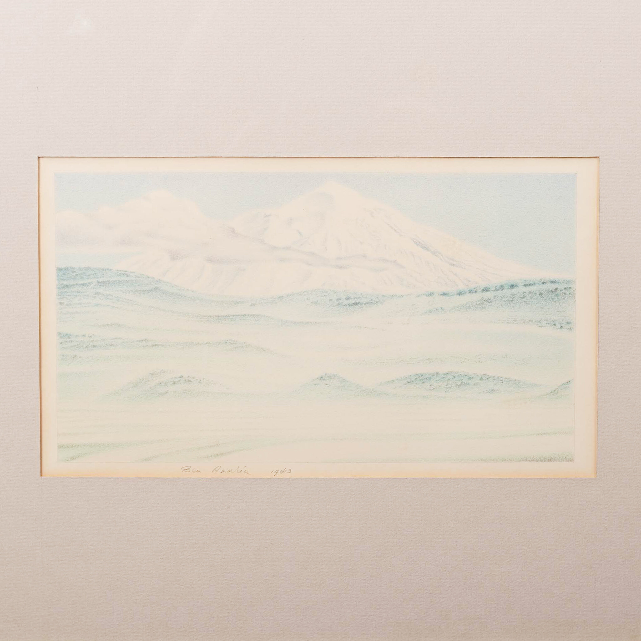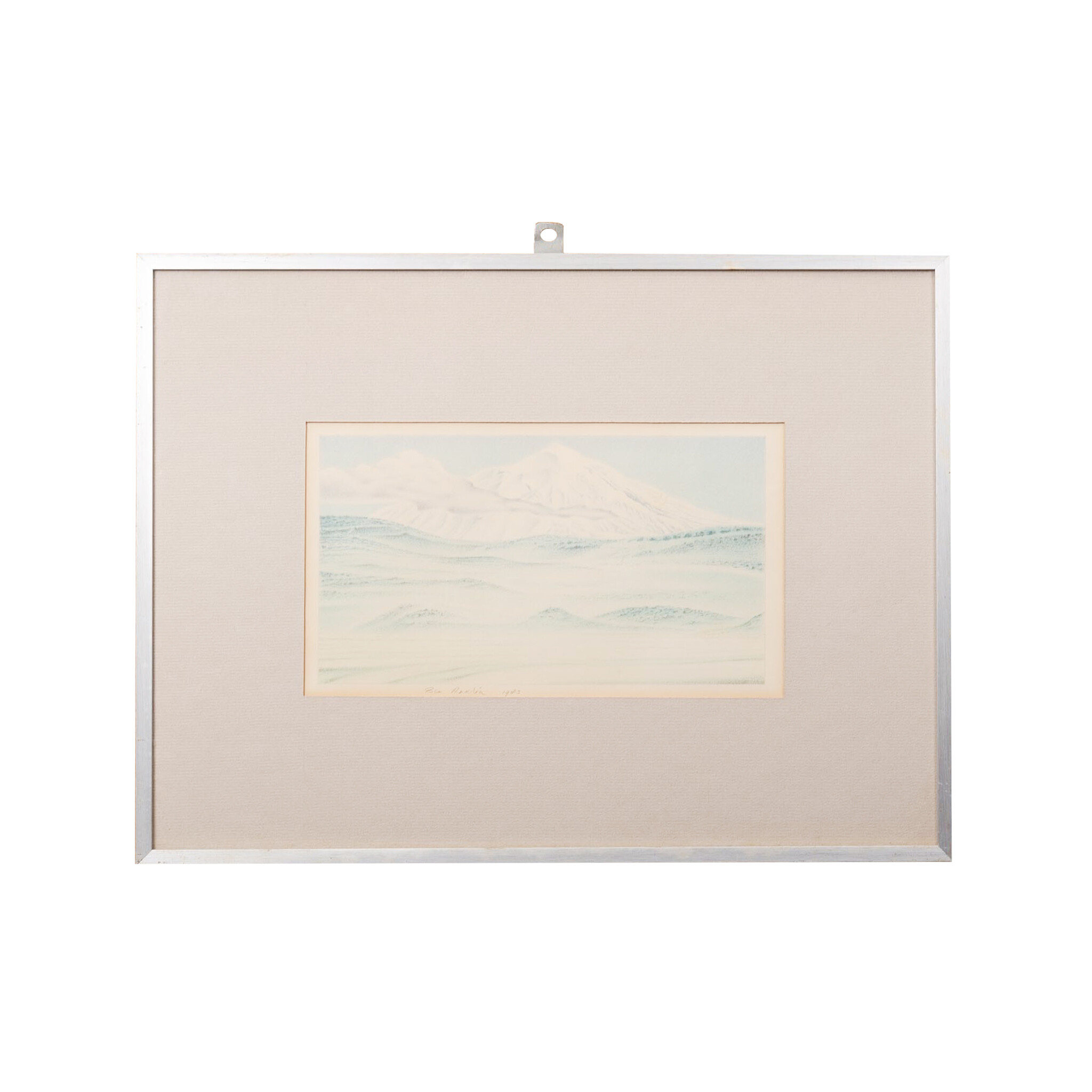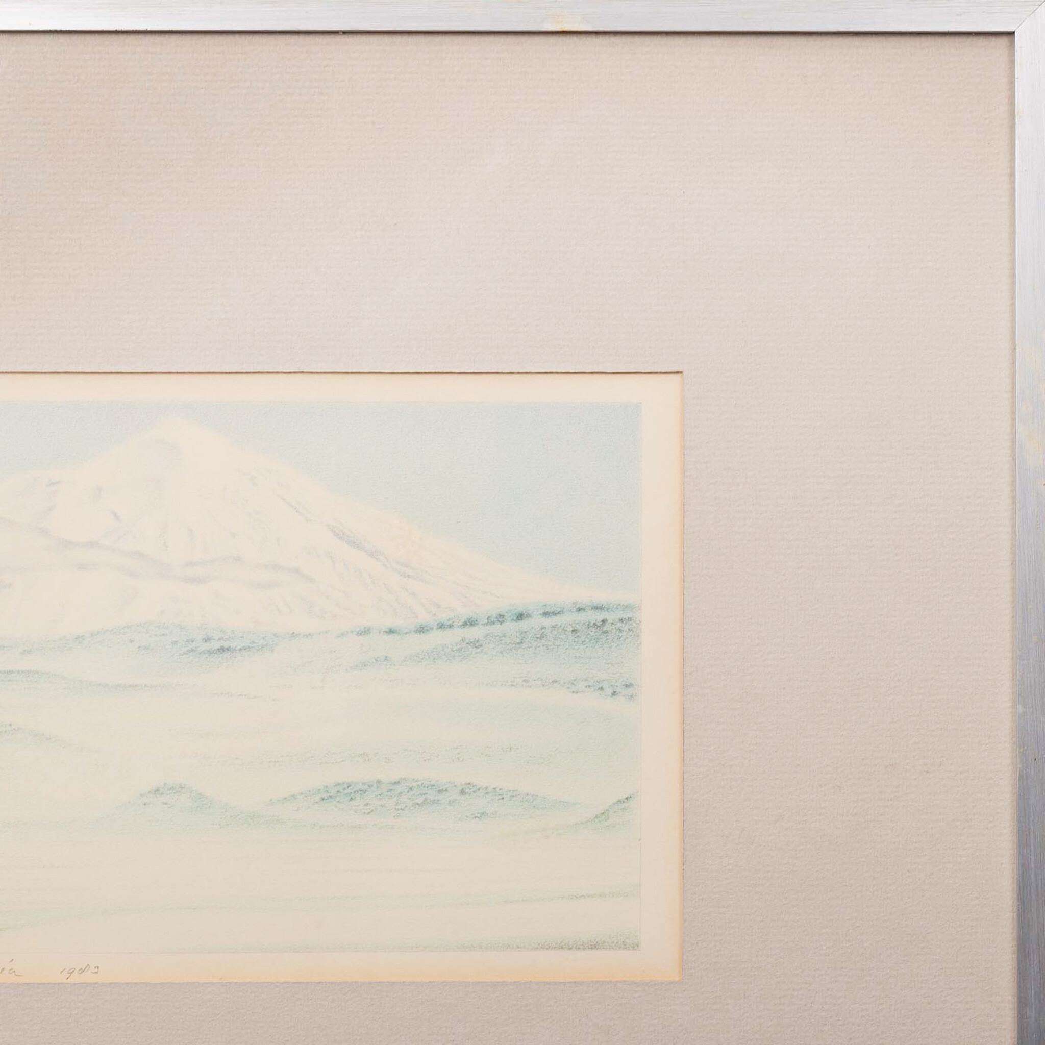 Ben Andrea, De Berg Ararat, 1983. Keurpotlood op papier in metalen lijst. Afbeelding van een landschap waar een witte berg uitsteekt met bewolking ervoor. Signatuur midden onder. Conditie: werk is wat verkleurd en lijst toont gebruikssporen als krasjes en vlekjes. Afmeting lijst: 30 x 40 cm, beeldvlak: 13 x 23 cm.