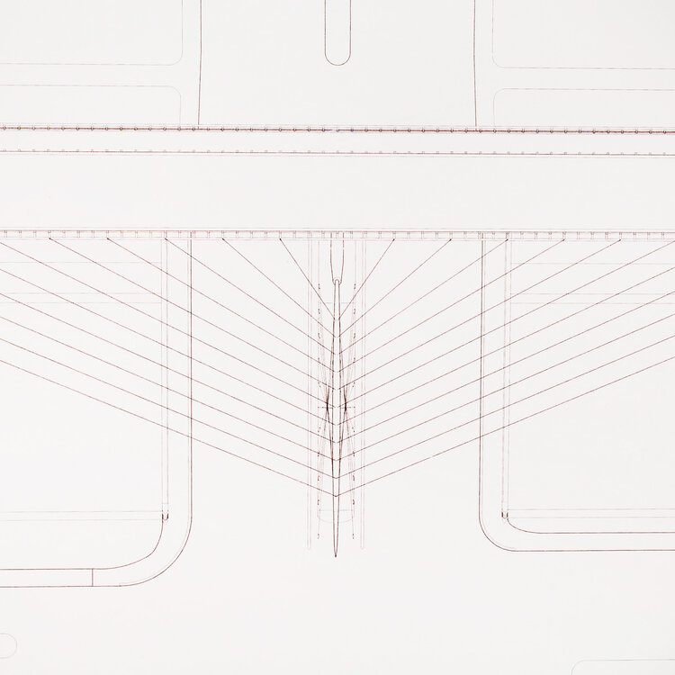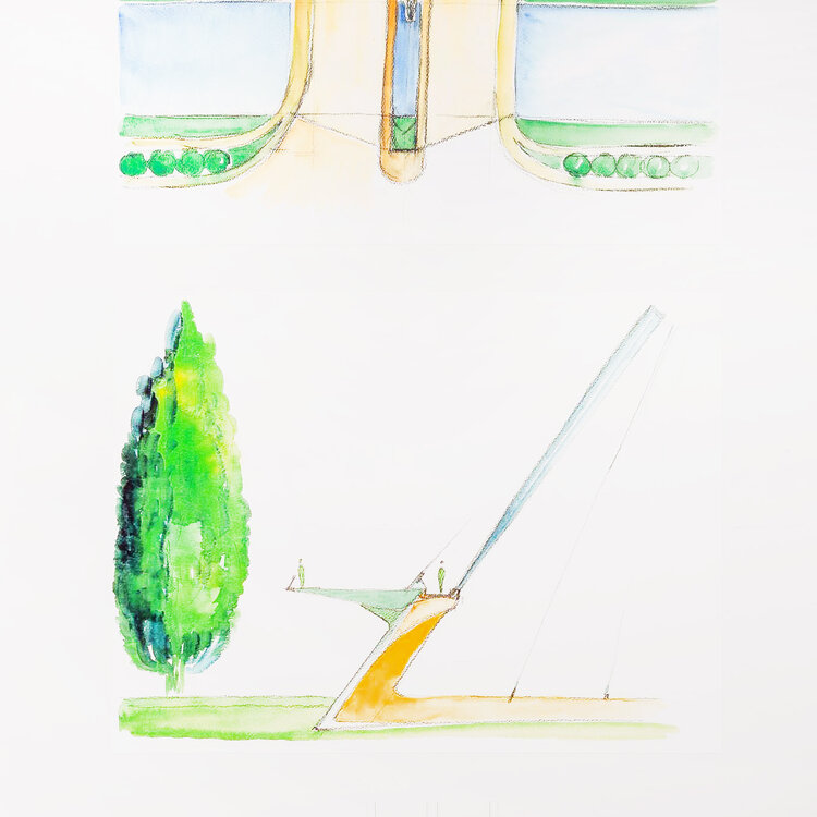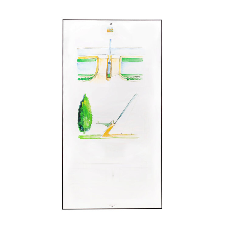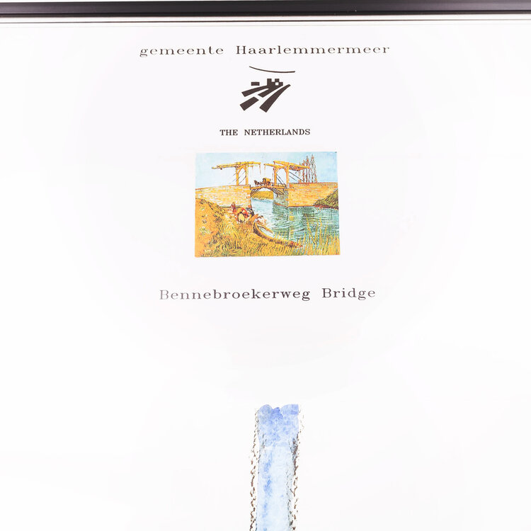 Bennebroekerweg Brug, Santiago Calatrava Falls. Afdruk van diverse schetsen en technische tekening van het bovenaanzicht van de Bennebroekerweg brug door architectenbureau Calatrava. Vermoedelijk gebruikt als presentatiemateriaal voor de Gemeente Haarlemmermeer. Ingelijst in zwarte lijst met plexiglas. Datering: onbekend. Conditie: goed. Afmetingen: ca. 180 x 90 cm.
