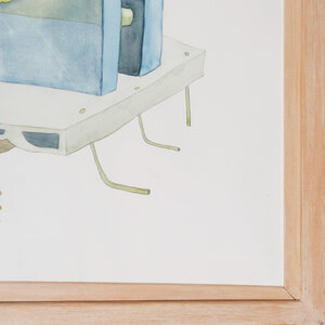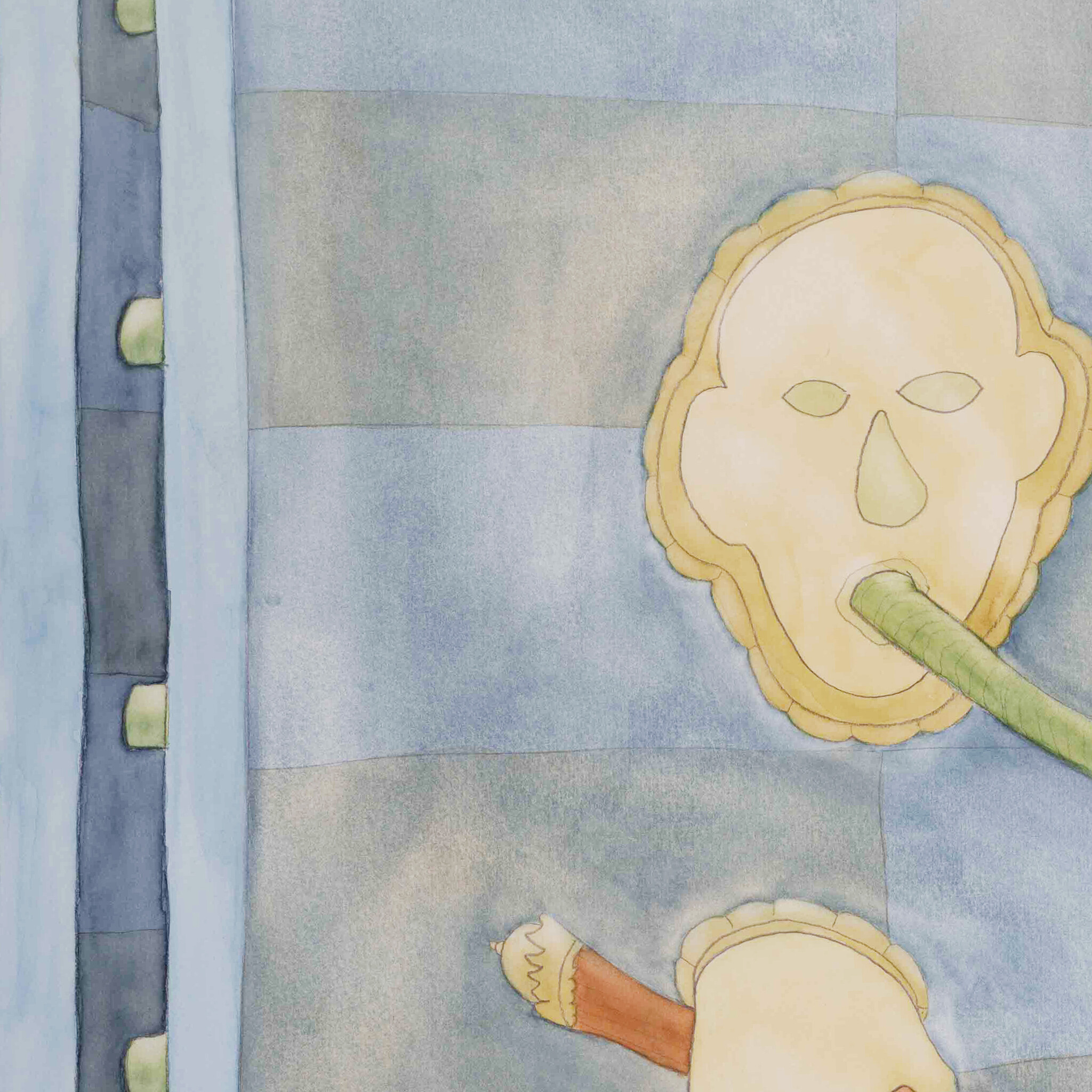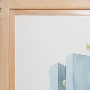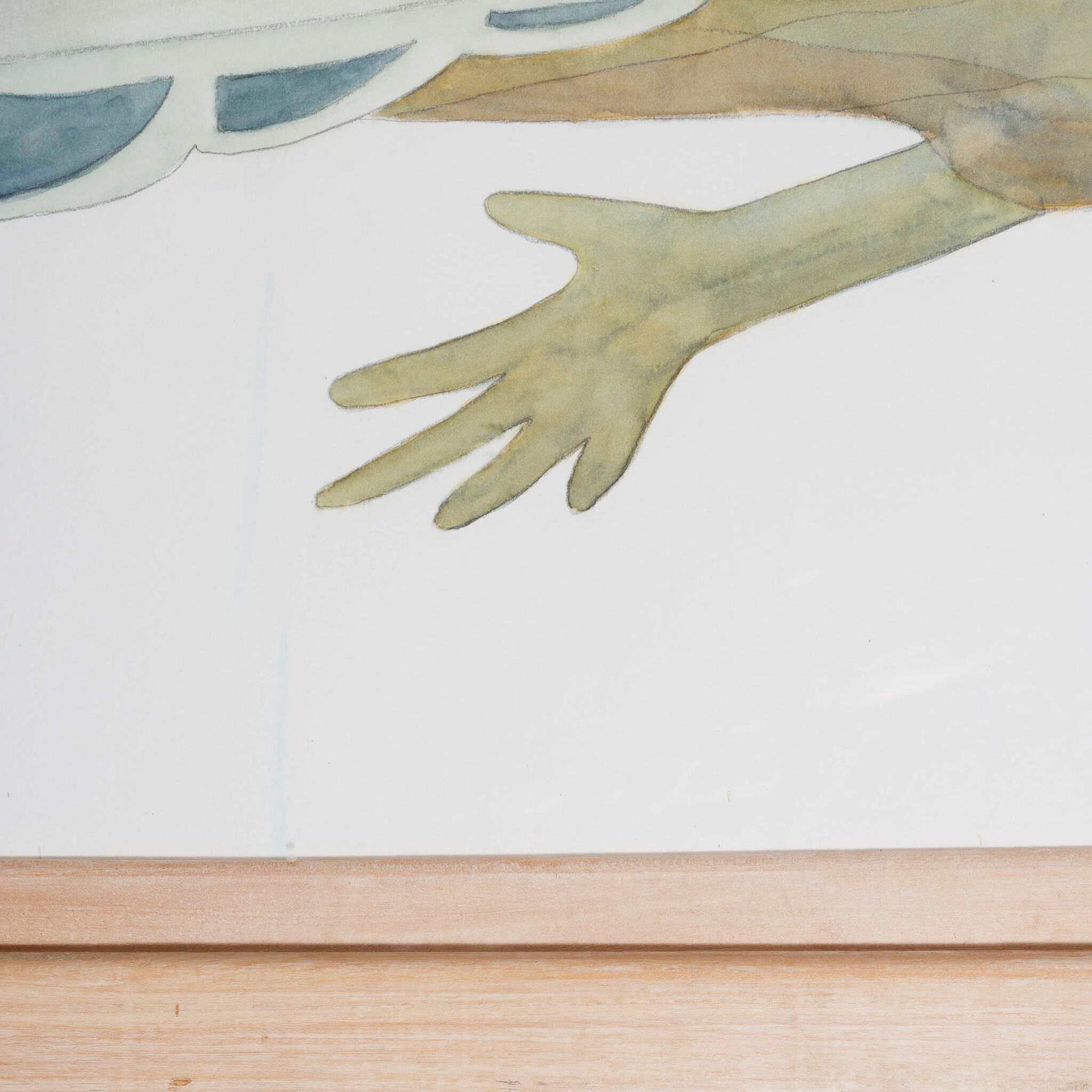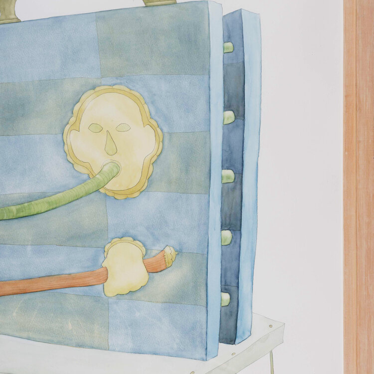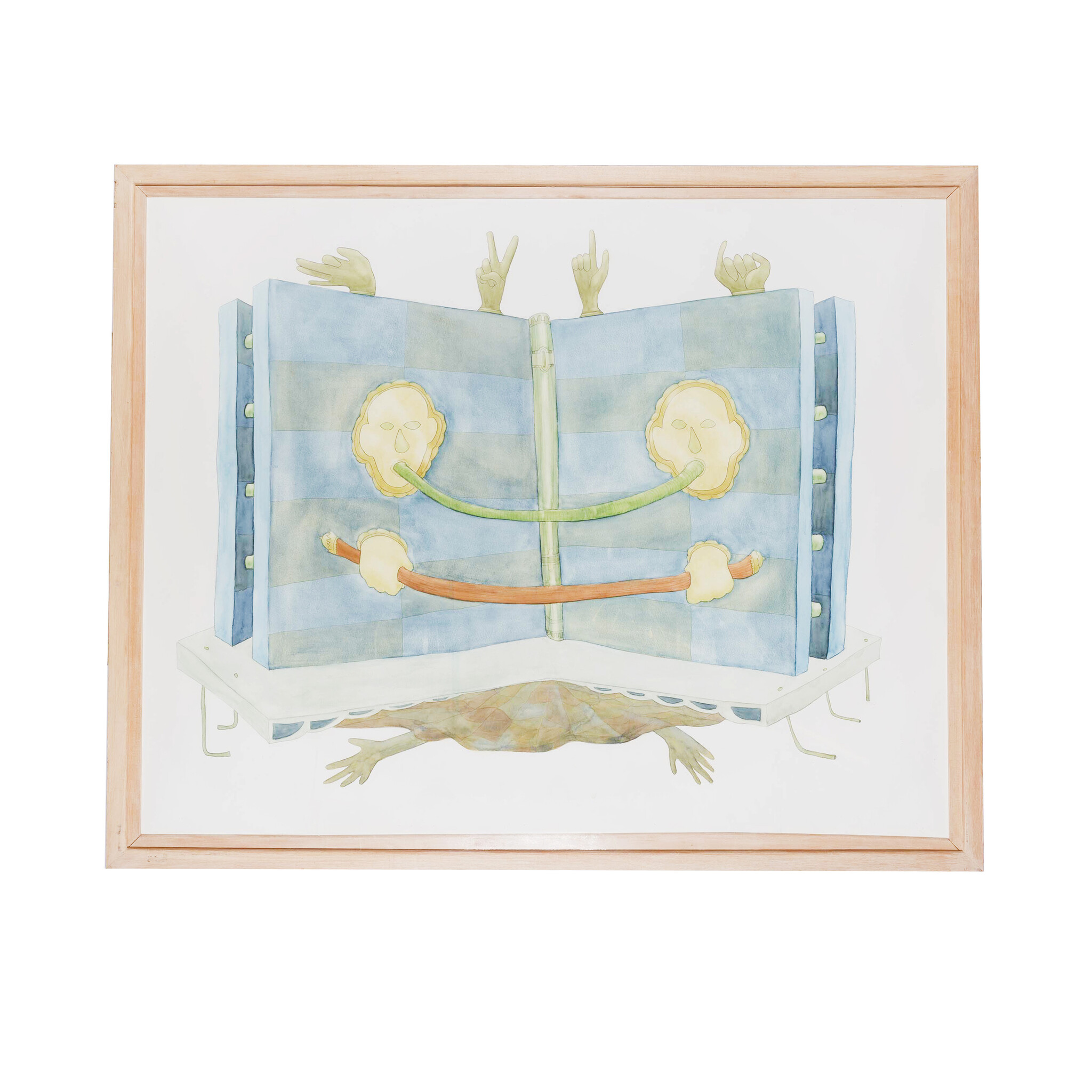 Bernard Divendal, 'Onnut, direct', datering onbekend. Tekening in houten lijst met kunststof plaat. Afbeelding van twee koppen, waarvan de monden en beide handen via een stengel met elkaar verbonden zijn. Boven en onder steken handjes uit. In de kleuren blauw, groen en geel. Signatuur ontbreekt. Divendal woont en werkt in Groningen. Conditie: lijst vertoont gebruikssporen. Afmetingen incl lijst: ca 101 x 126 cm.