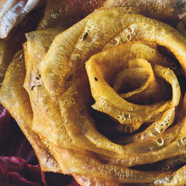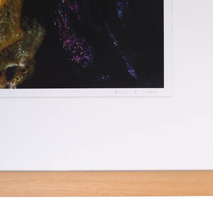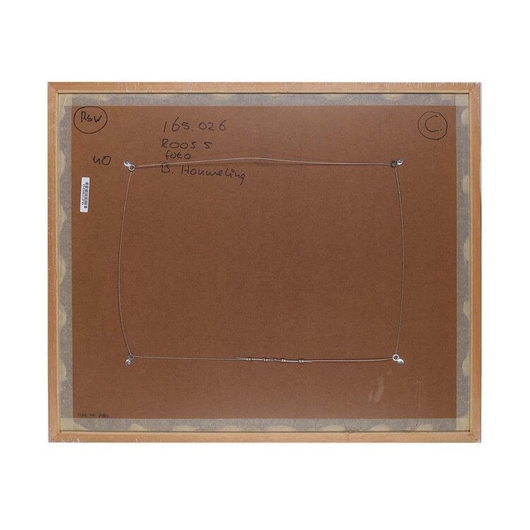 Bert Houweling, Roos 5, jaartal onbekend. Kleurenfoto in houten lijst, oplage 13/60. Close-up van een gele roos bedekt met waterdruppels. Linksonder signatuur, rechtsonder titel en oplagenummer. Conditie: goed, gebruikssporen aan lijst. Afmeting werk zonder lijst: 45 x 61 cm.