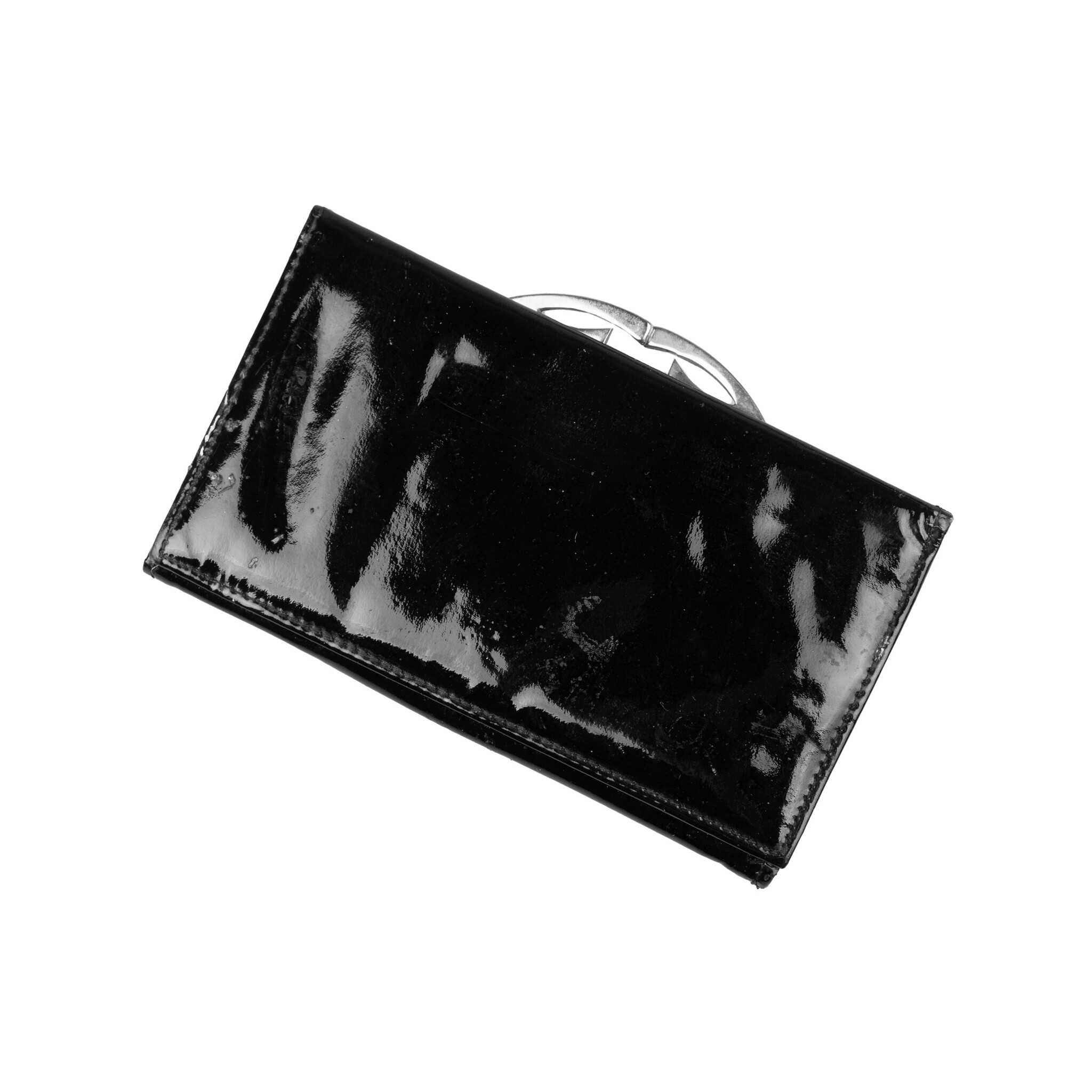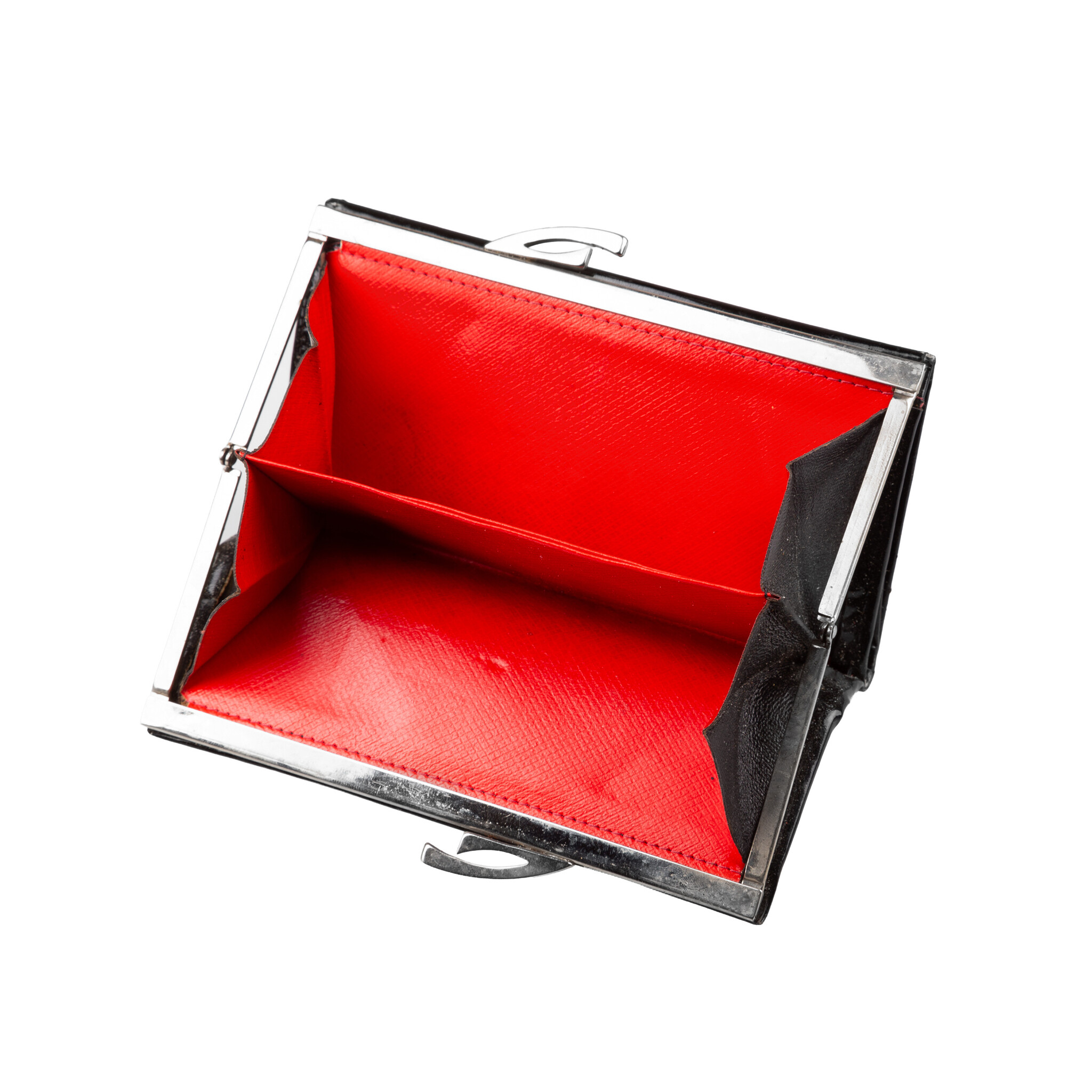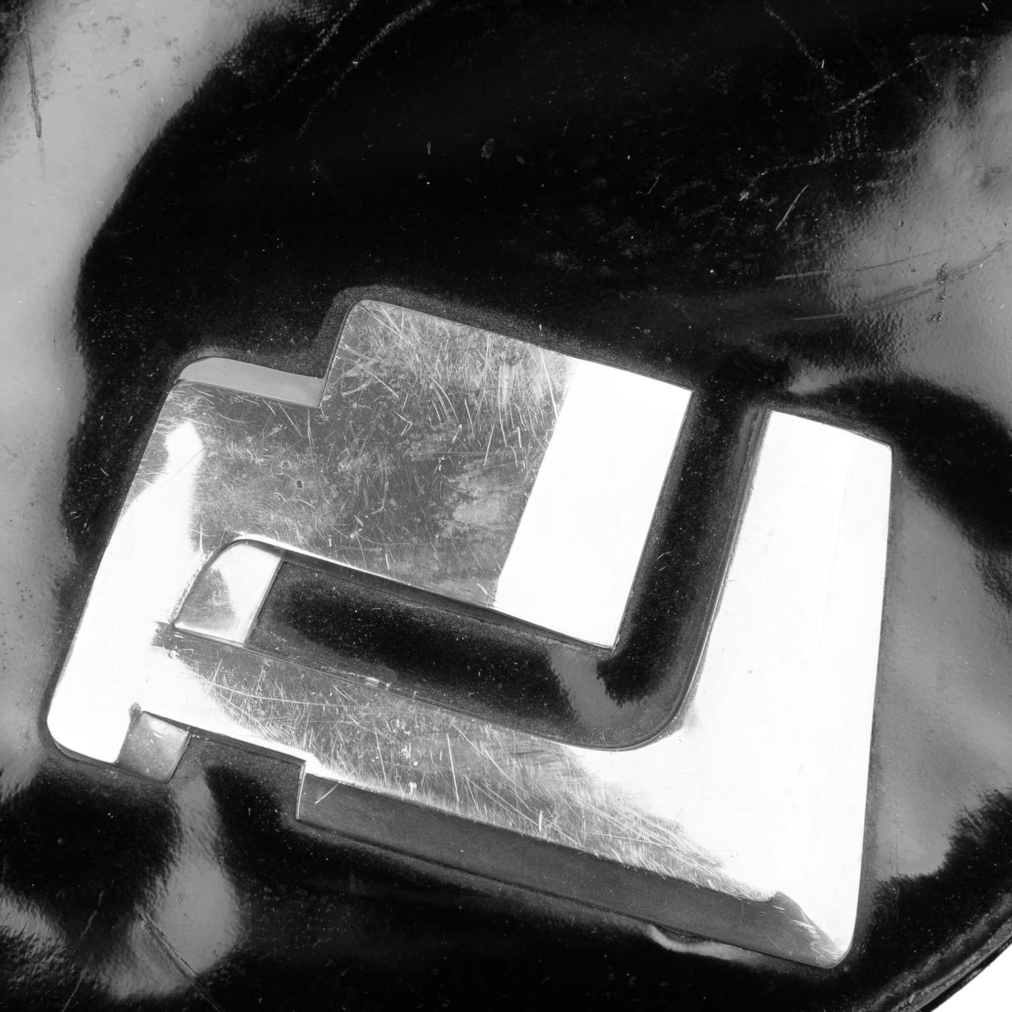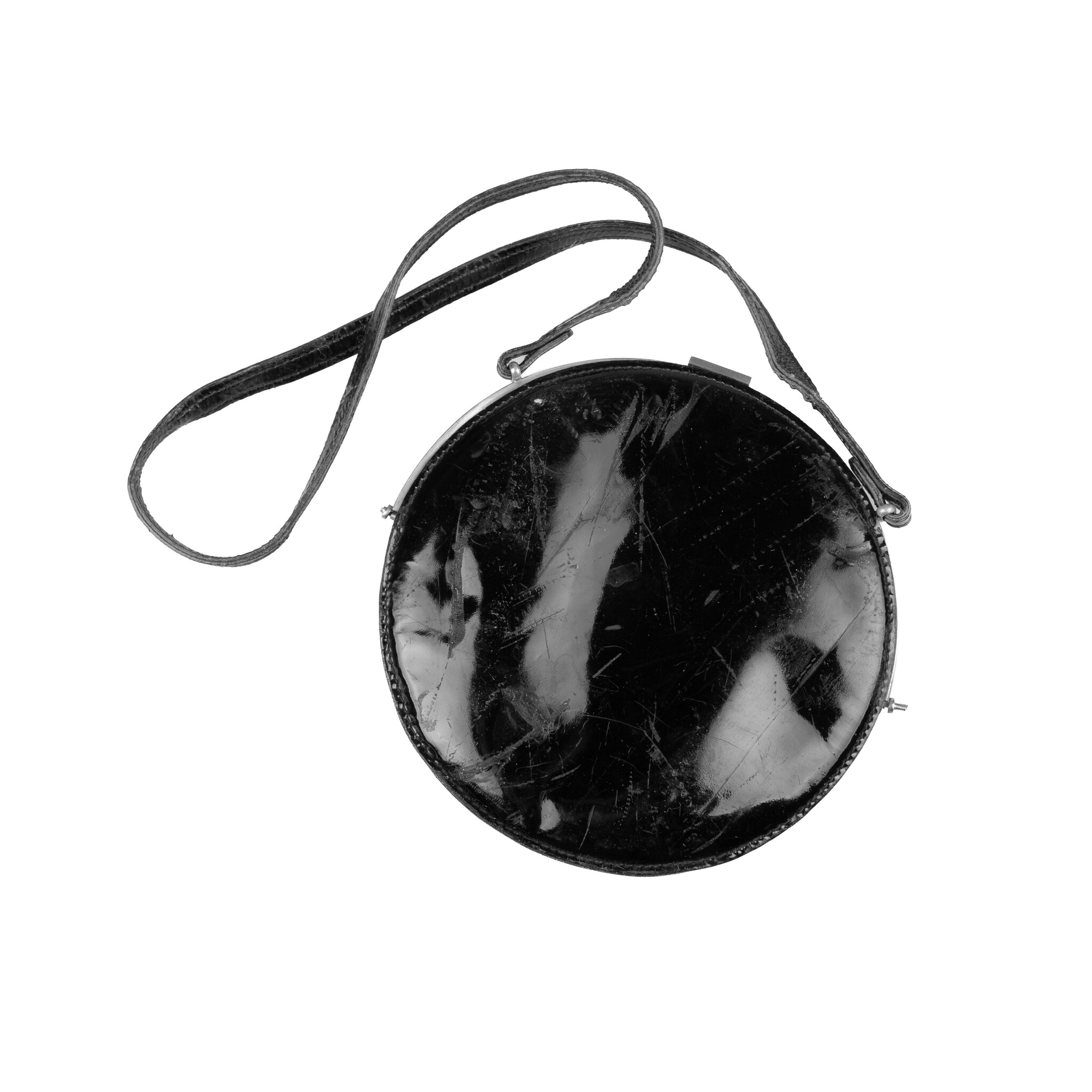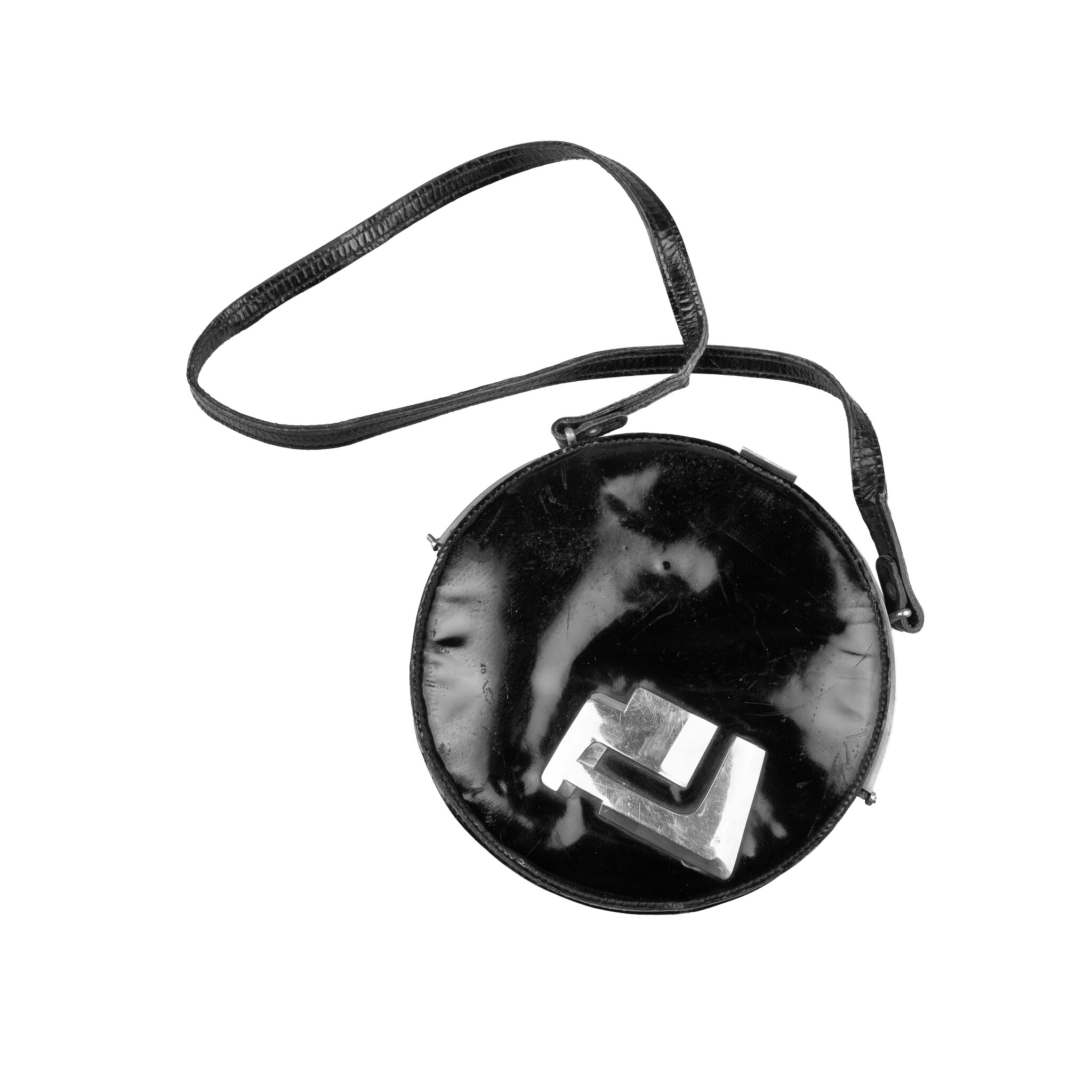 Zwarte tas en portemonnee, 20ste eeuw. Ronde tas in zwart lakleer met zilveren logo van Pierre Cardin, jaren 60. De tas heeft een schouderriem en de binnenzijde is bekleed met zwart leer; Zwarte portemonnee in zwart lakleer met rode binnenzijde en twee compartimenten. Conditie: vertonen sporen van gebruik, zoals slijtage en vlekken. Afmetingen tas: ca. 20 x 20 x 2 cm; hoogte met hengsel 56 cm. Afmetingen portemonnee: ca. 8 x 14 x 1,5 cm.