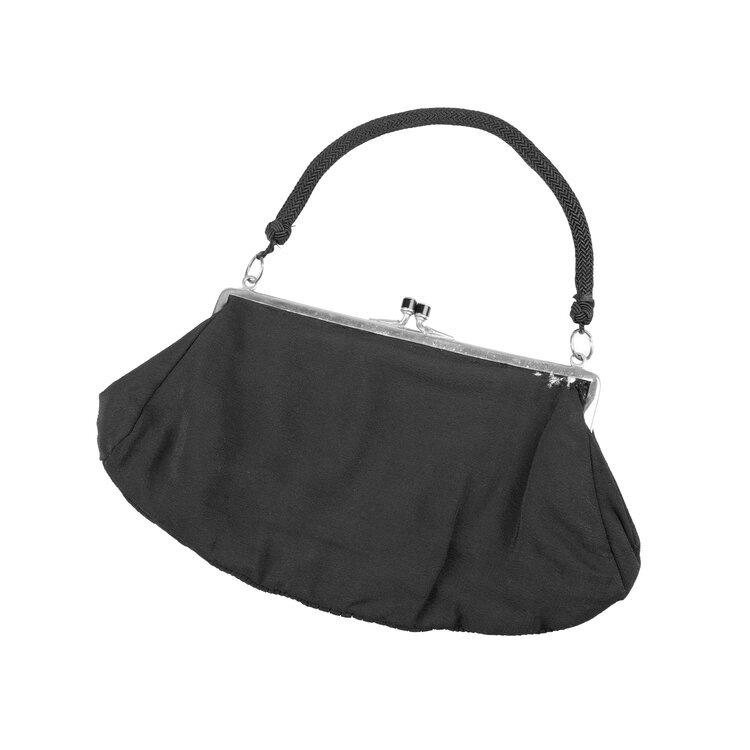 Zwarte clutch, portemonneetje en etuitje, 20ste eeuw. De zwarte clutch van textiel waarvan de voorzijde is geplooid, heeft een zilverkleurige beugelsluiting; Het zwarte portemonneetje heeft aan de voorzijde een borduursel van een bloempatroon in petit poi