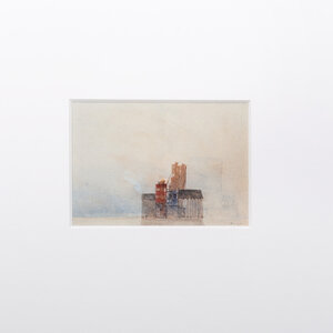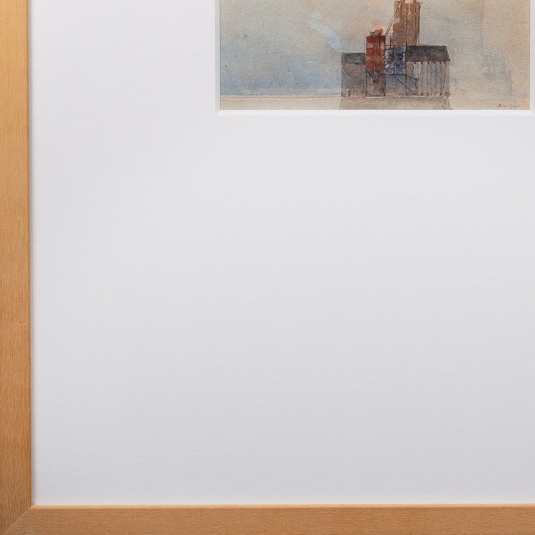 Bob Nieuwenhuysen (Amsterdam, 1946 - 2010), 'Fabriek IV'. Aquarel op papier in houten lijst met passe-partout. Afbeelding van een fabriek in bruintinten. Signatuur rechtsonder. Datering: 1980. Conditie: verkleuring werk, gebruikssporen lijst. Afmetingen lijst: 44 x 37 cm; beeldvlak: 10 x 15 cm.