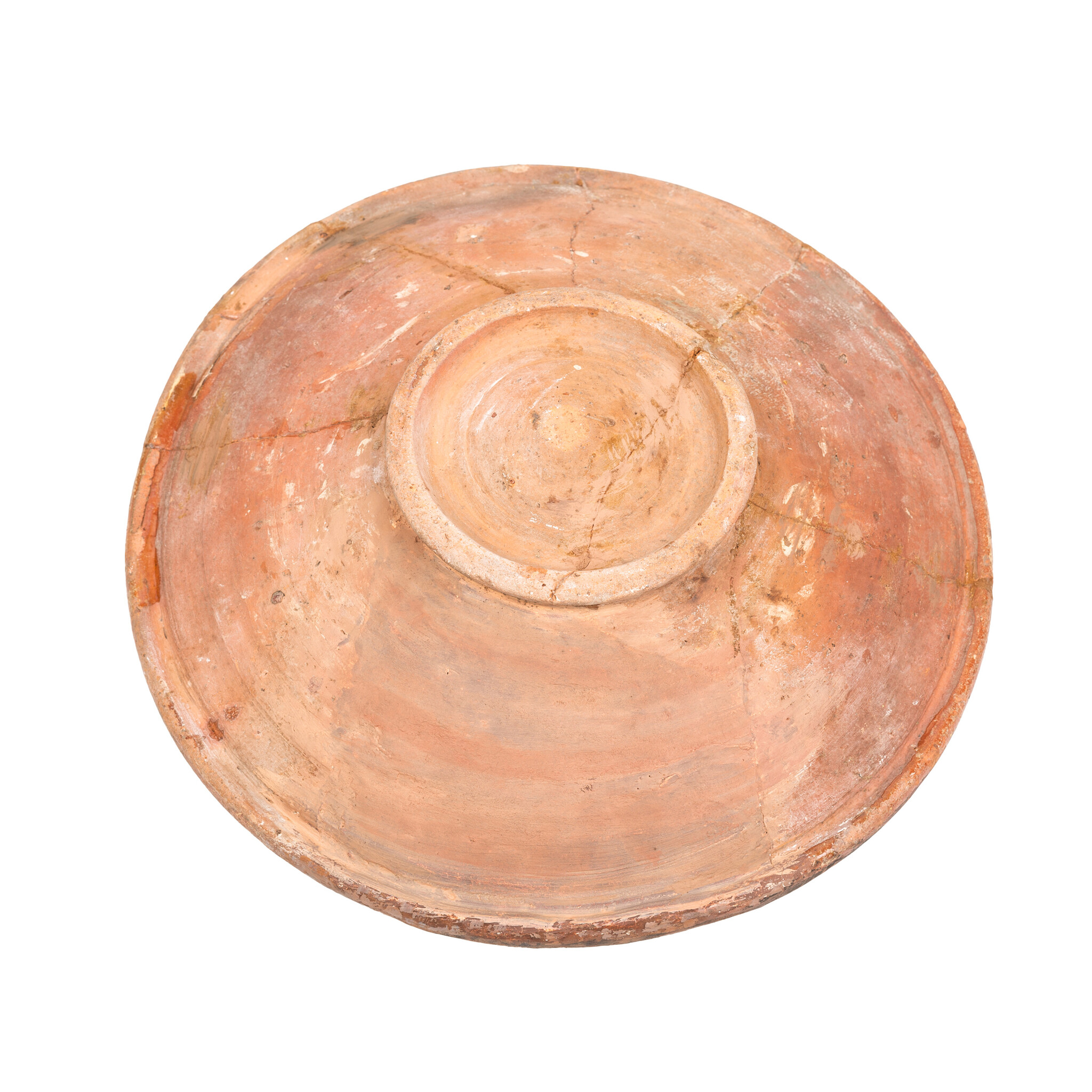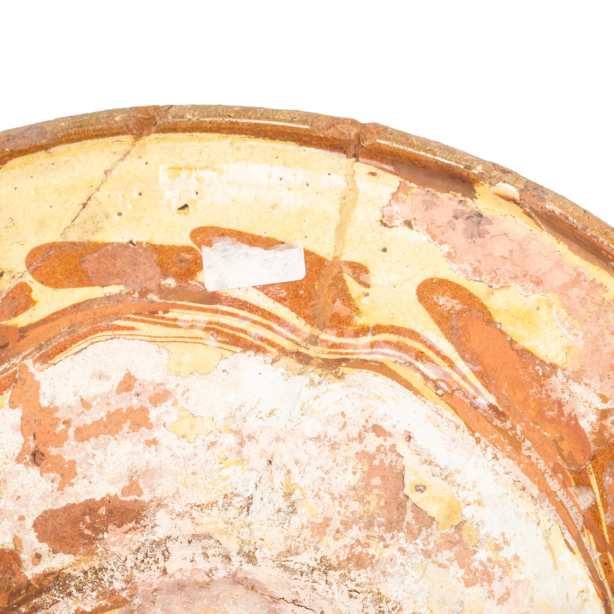 Schaal van slibaardewerk met versiering in spiraalvorm. De schaal van rood geglazuurd aardewerk, heeft een gele bovenkant en is bewerkt met de ringeloortechniek, waarbij een versiering van wit slib is opgebracht op de nog ongebakken schaal. De slibversiering wordt voor het bakken op de schaal aangebracht als versiering. Dit gebeurde vroeger met een uitgeholde koehoorn, waarvan de punt was afgeslepen en in de opening een afgeschuinde rietstengel werd geschoven. Het gaat vermoedelijk om een bodemvondst. Datering: 17e-18e eeuw. Conditie: het aardewerk is gerestaureerd, is beschadigd en delen van het glazuur zijn verdwenen. Afmetingen: ca. 7 x Ø 31 cm.