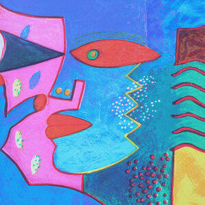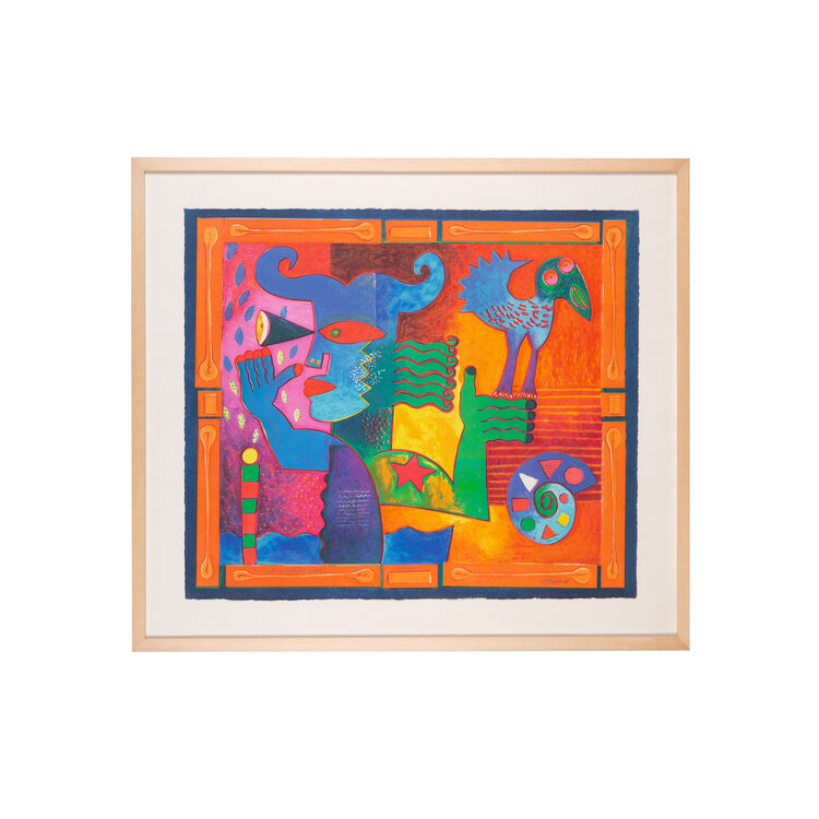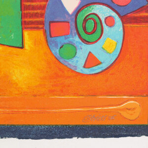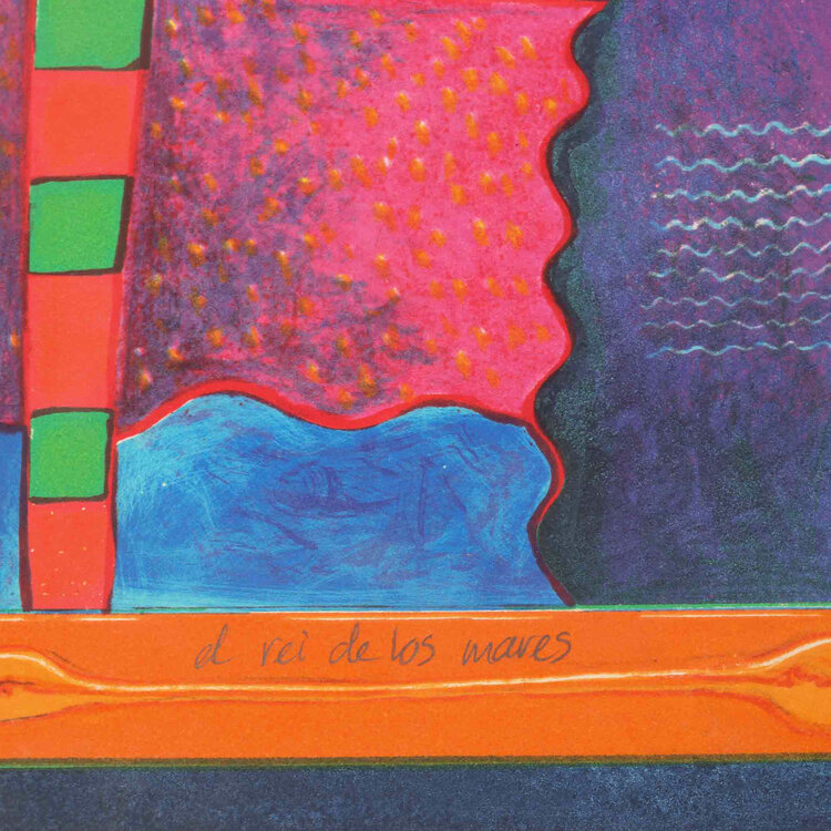 C. Briels, 'El rei de los mares', 2006. Carborundum litho in zwart metalen lijst, oplage 122/200. Abstracte voorstelling van kleurrijke figuren met daar omheen een oranje en blauw kader. Linksonder titel, in midden oplagenummer en rechts signatuur en jaartal. Conditie: goed, lijst vertoont gebruikssporen. Afmeting lijst: 71 x 71 cm. Afmeting werk: 57 x 67 cm.