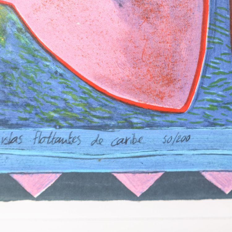 C. Briels, Islas flotantes de caribe, 2002. Carborundum litho in metalen lijst, oplage 50/200. Kleurrijke abstracte afbeelding van diverse lichaamsdelen en een vogel, rondom een omlijsting in blauw en paars. Linksonder titel daarnaast oplagenummer, signatuur en jaartal. Conditie: gebruikssporen aan lijst. Afmeting werk zonder lijst: 58 x 69 cm, incl. lijst: 79 x 92 cm.