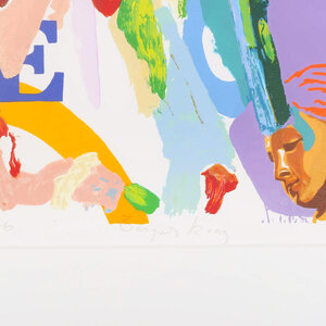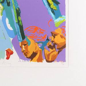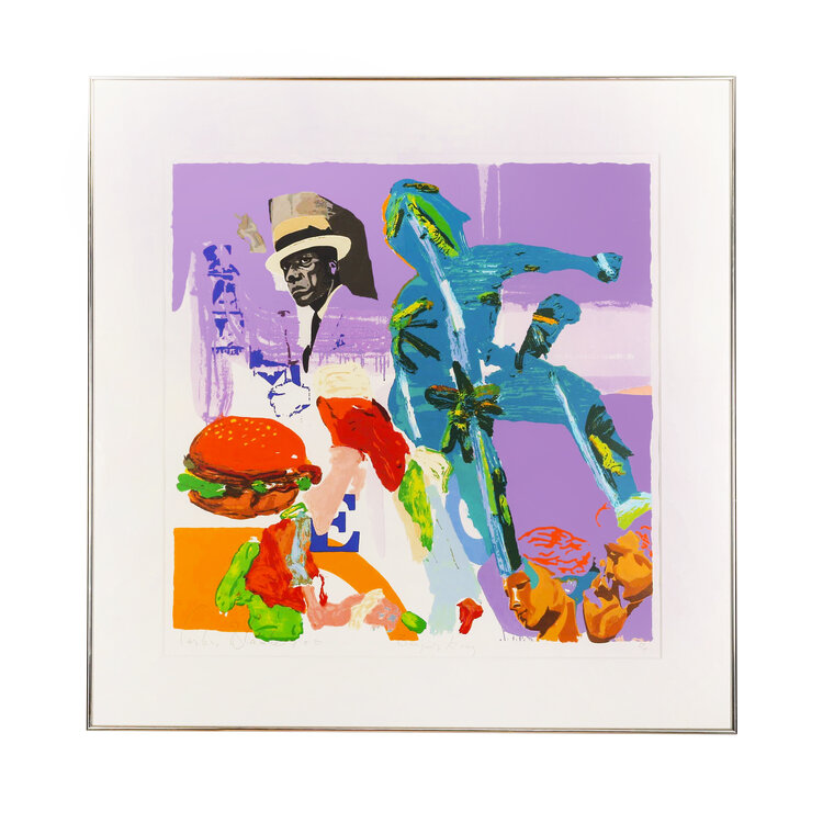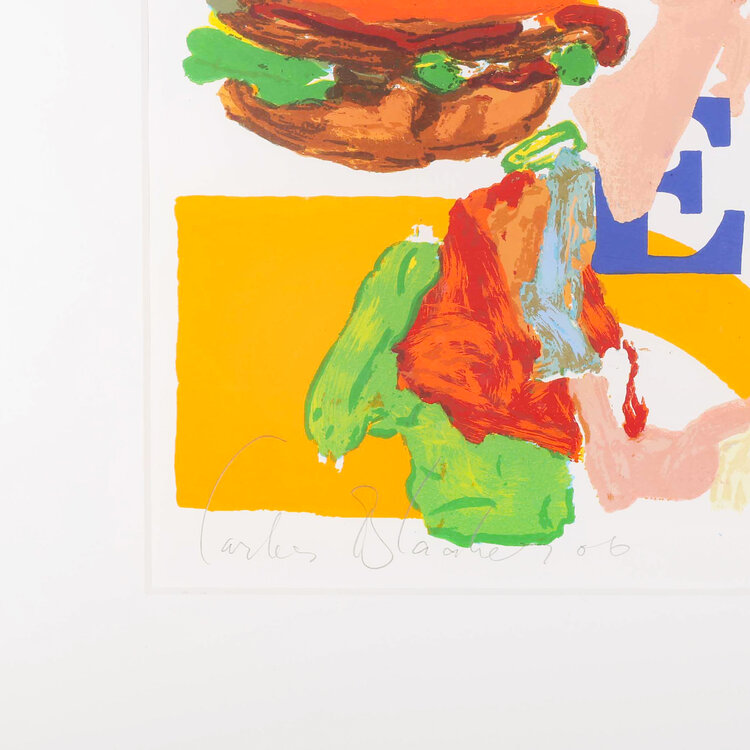 Carlos Blaaker, Burger King, 2006. Zeefdruk in passe-partout zonder lijst, oplage E/A. Abstracte voorstelling voor paarse achtergrond met links een portret van een man in zwart-wit met daaronder een hamburger en rechts een figuur in blauw-groen. Linksonder signatuur en jaar, in midden titel, rechtsonder E/A. Conditie: gebruikssporen aan lijst. Afmeting werk zonder passe-partout: 70 x 70 cm.