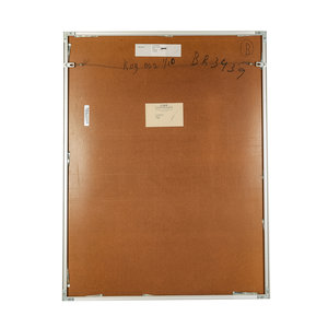 Cees Kortlang, Koning Leeuw, 1988. Ets in metalen lijst, oplage 1/10. Abstracte voorstelling van grijze vormen met blauwe accenten voor een donkere achtergrond. Linksonder oplagenummer rechtsonder signatuur en jaartal. Conditie: goed, gebruikssporen aan lijst. Afmeting lijst: 90 x 70 cm.