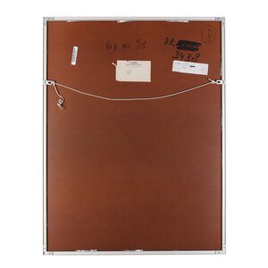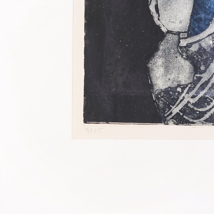 Cees Kortlang, Pyramide monster III, 1987. Ets in metalen lijst, oplage 4/15. Abstracte compositie in zwart, grijs en blauw. Linksonder oplagenummer rechtsonder signatuur en jaartal. Conditie: gebruikssporen aan lijst, rechtsboven wat viezigheid op het glas. Afmeting lijst: 90 x 70 cm.
