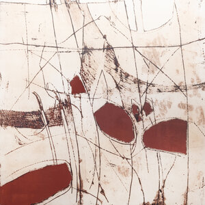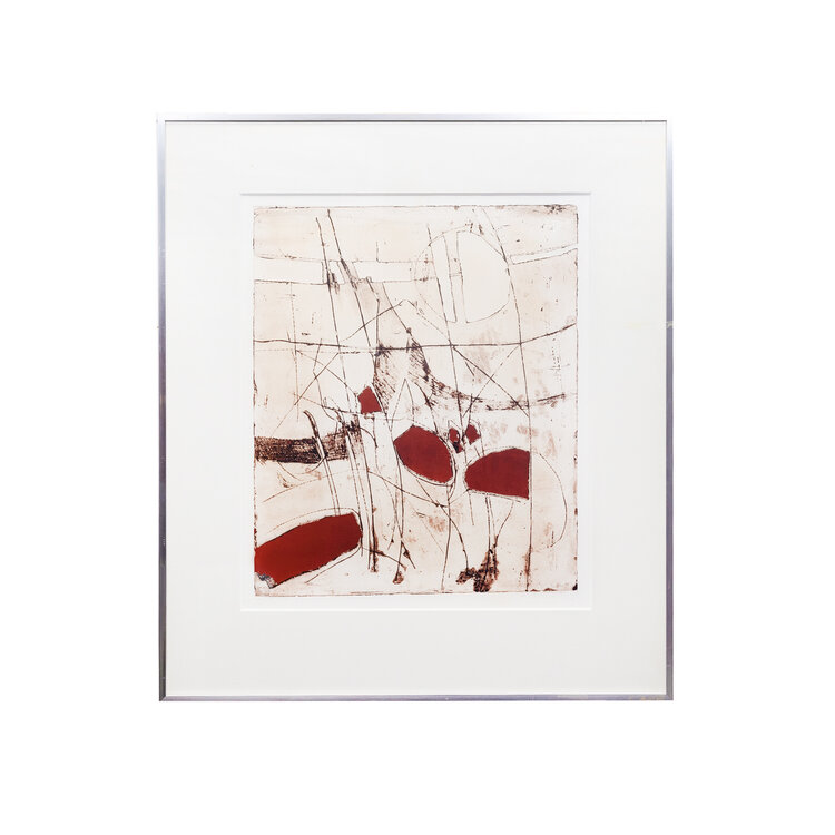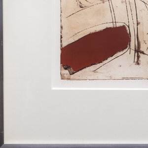 Cees Kortlang, 'Zonder Titel'. Ets oplage 1/15, in metalen lijst met passe-partout. Abstract werk van vlakken en lijnen in bruin- en beigetinten. Signatuur rechtsonder. Datering: 1995. Conditie: vlekken op passe-partout, gebruikssporen lijst, taperesten op lijst en glas. Afmetingen lijst: 70,5 x 60,5 cm; beeldvlak: 46 x 38 cm.