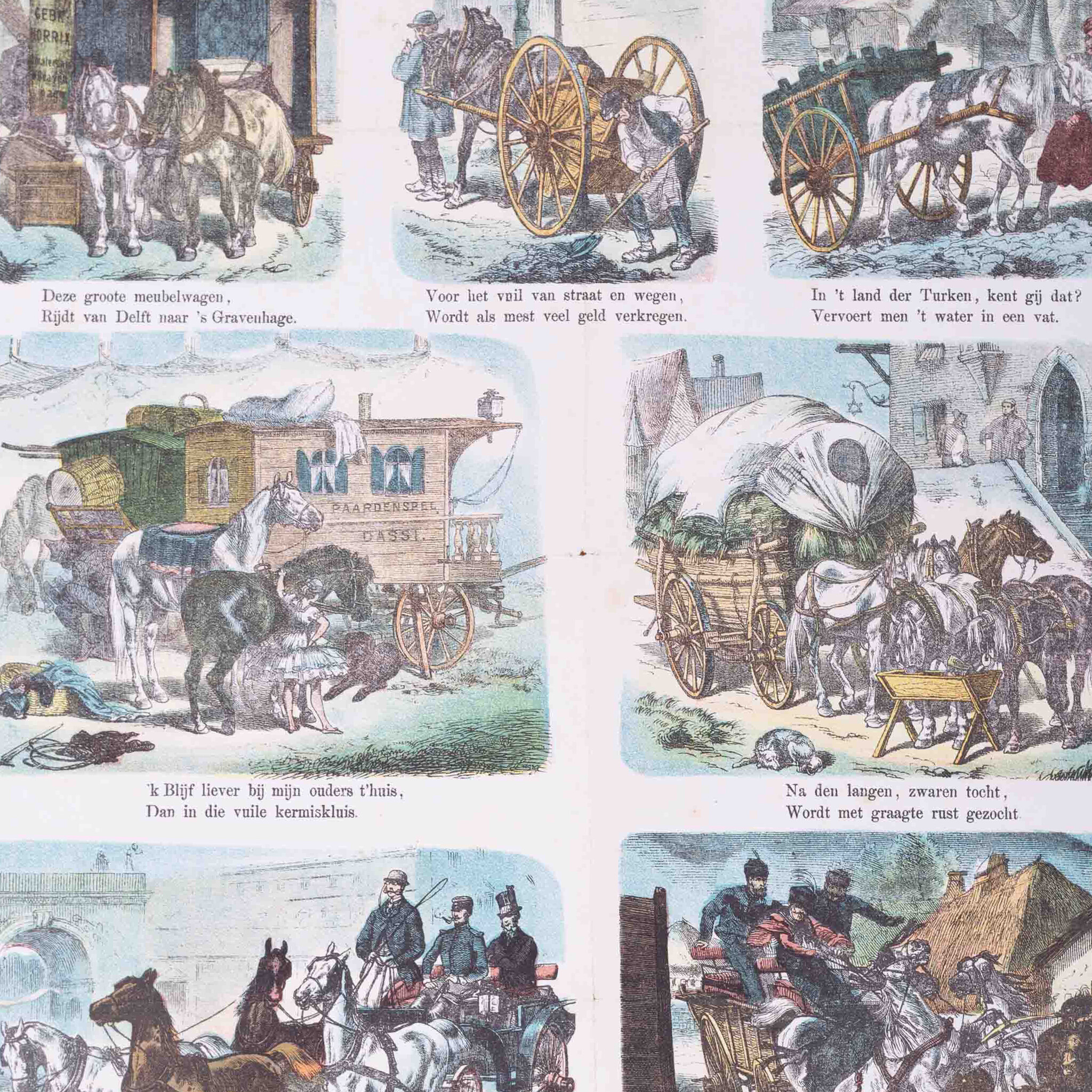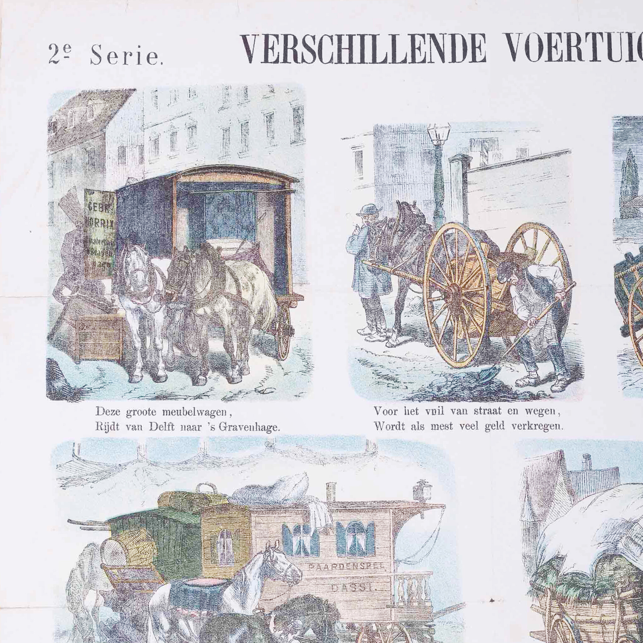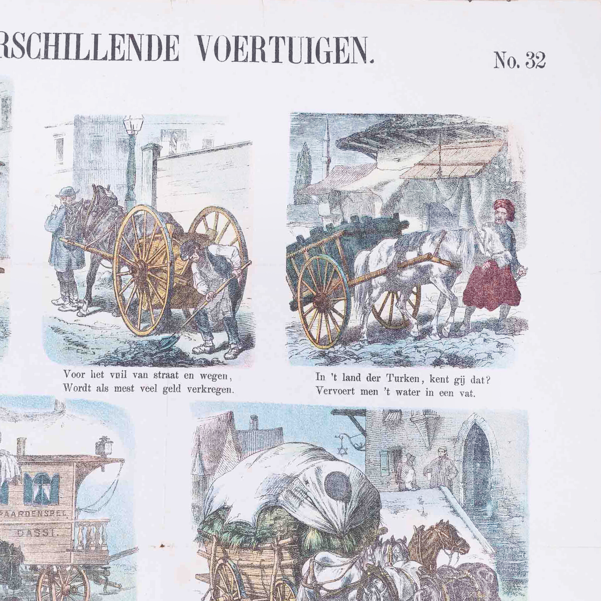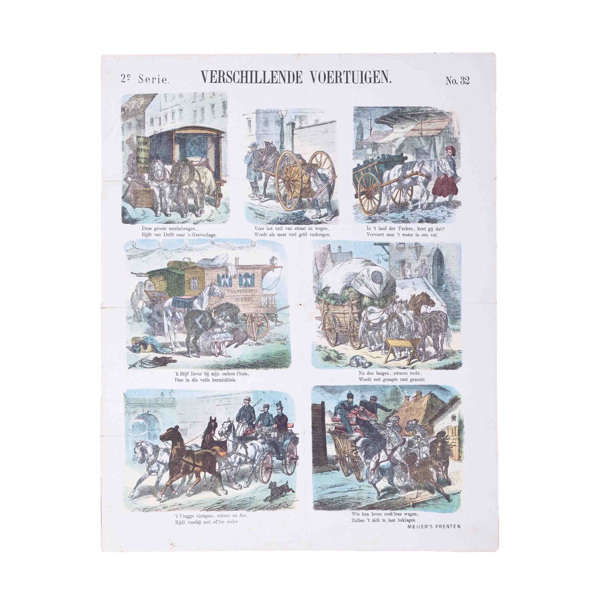 Centsprent 'Verschillende voertuigen'(Nº 32), vervaardigd door Meijer's prenten. Datering: circa 1874. Litho van zeven gekleurde afbeeldingen met paarden en wagens. Elke afbeelding met een tweeregelig rijmpje. Het Fries Museum en het Westfries zijn ook in het bezit van een exemplaar van deze prent. Centsprenten deden ruim drie eeuwen lang dienst als krant, als geïllustreerde bron van verhalen of als beeldverhaal met teksten. Wie geen geld had voor boeken, kon altijd wel voor een cent een prent kopen bij marskramers, venters of in winkels. Conditie: De prent toont sporen van ouderdom, zoals verkleuring en beschadigingen. Vouwlijnen zijn zichtbaar. Afmetingen: ca. 43 x 34,5 cm.
