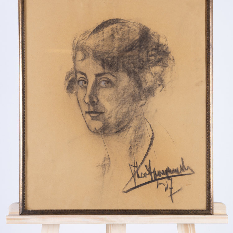 Theo Swagemakers, Houtskooltekening van een vrouw, 1927. Houtskool op papier, 51.5 x 44 cm. Schetsmatig portret van een vrouw in houtskool, ingelijst achter glas en gesigneerd rechtsonder. Theo Swagemakers (1898-1994) is een bekende Nederlandse schilder van voornamelijk portretten en stillevens. Hij genoot zijn opleiding in Brussel en Parijs en heeft verschillende beroemdheden mogen portretteren, zoals een groot deel van de Koninklijke familie. Hiervoor heeft hij de Thérèse van Duyl-Schwartzeprijs in ontvangst mogen nemen in 1958. Conditie: het werk is in goede conditie. De lijst vertoont enkele sporen van gebruik, zoals slijtage op de hoeken, met name linksonder.