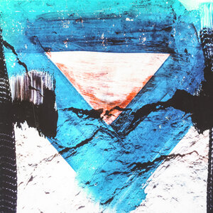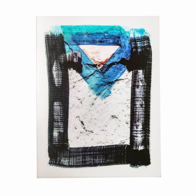 Clemens Zalm, Spaans wit, jaartal onbekend. Foto in plexiglas, nr. 2. Zwart-wit foto van een grond structuur bewerkt met zwarte en blauwe lijnen en een rood vlak. Conditie: gebruikssporen op het plexiglas. Afmeting: 100 x 77 cm.